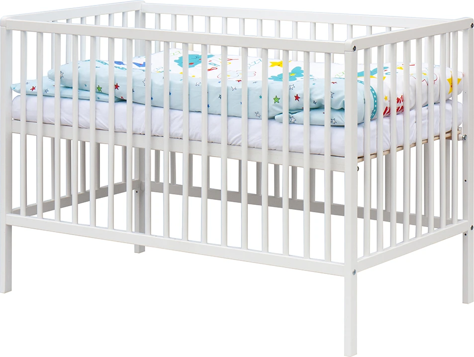 1. Dětská dřevěná postýlka 120 x 60 cm - bílá, masiv buk, 3 vyndavací příčky, 2 polohy roštu,