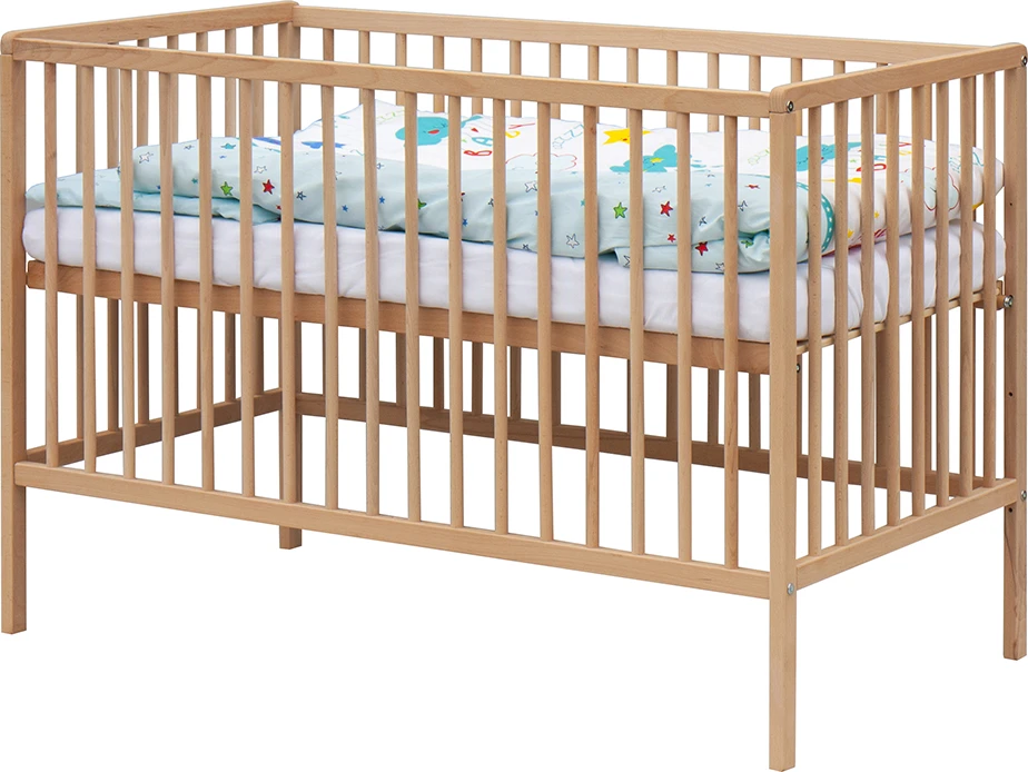 1. Dětská dřevěná postýlka 120 x 60 cm - přírodní, masiv buk, 3 vyndavací příčky, 2 polohy roštu,