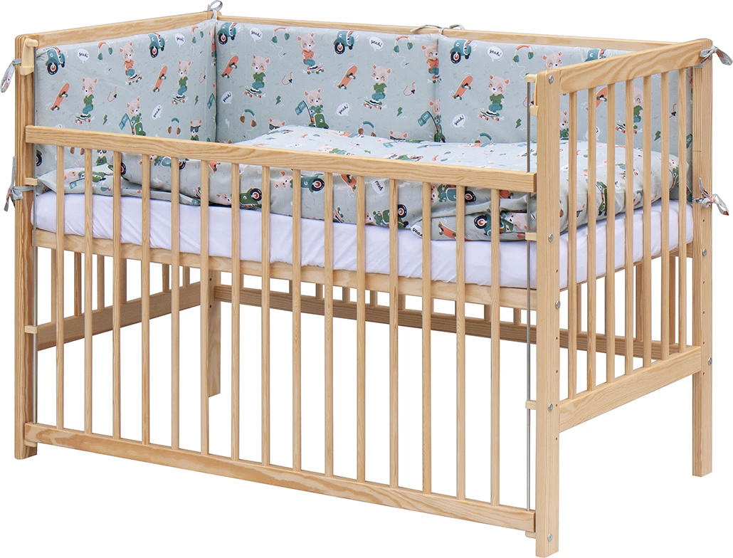 1. Dětská dřevěná postýlka 120 x 60 cm - přírodní, masiv borovice, stahovací bok, 6 poloh roštu