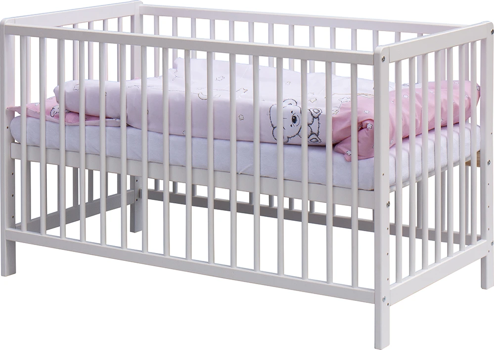 1. Dětská dřevěná postýlka 120x60 cm - bílá, masiv borovice, 3 vyndavací příčky, 5 poloh roštu