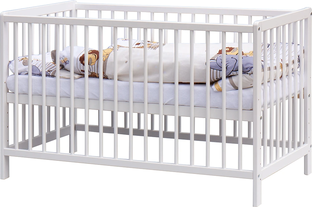 1. Dětská dřevěná postýlka 120x60 cm - bílá, masiv borovice, 3 vyndavací příčky, 5 poloh roštu