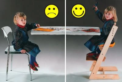 Dítě sedící na nevyhovující židli se snaží instinktivně dotknout podlahy alespoň prsty jedné nohy a také se nemůže opřít. Výsledkem toho je nesprávné zakřivení páteře. Navíc dochází ke stlačování měkkých tkání v podkolení a snižování průtoku krve v cévách v této oblasti, což kromě negativního zdravotního dopadu má i velký vliv na pohodlí a soustředění dítěte. Dítě je neklidné a snaží se tento tlak uvolnit kopáním nohama nebo častým střídáním poloh při jídle i psaní. Menší děti jsou na židlích pro dospělé dokonce nuceny klečet. Oči jsou i při podložení polštáři u menších i větších dětí v nesprávné výšce nad deskou stolu, což může vést i ke vzniku očních vad.