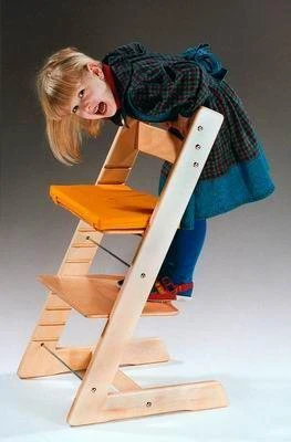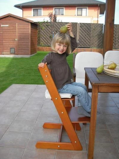 Židle roste s dítětem, protože sedátko, podnožka i opěrky, které jsou zasunuty v drážkách v bocích židle, jsou stavitelné. Boky jsou k sobě přitaženy dvěma kovovými svorníky. Tento systém umožňuje velmi rychlé a jednoduché přestavení, ale taky regulaci všech rozměrů, ke kterým v průběhu růstu dítěte dochází, tedy i hloubky sedu. Když už je horní, zkrácené, sedátko nedostačující, vzájemně je zaměníme s podnožkou. Tím získáme větší hloubku sedu. Délka jejího využití není potom limitována věkem, či hmotností člověka, ale pouze šířkou pánve.