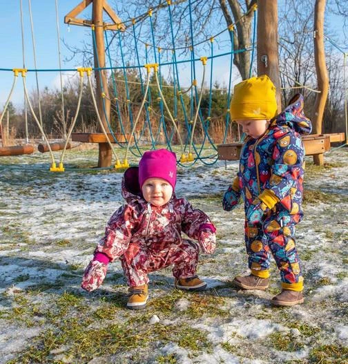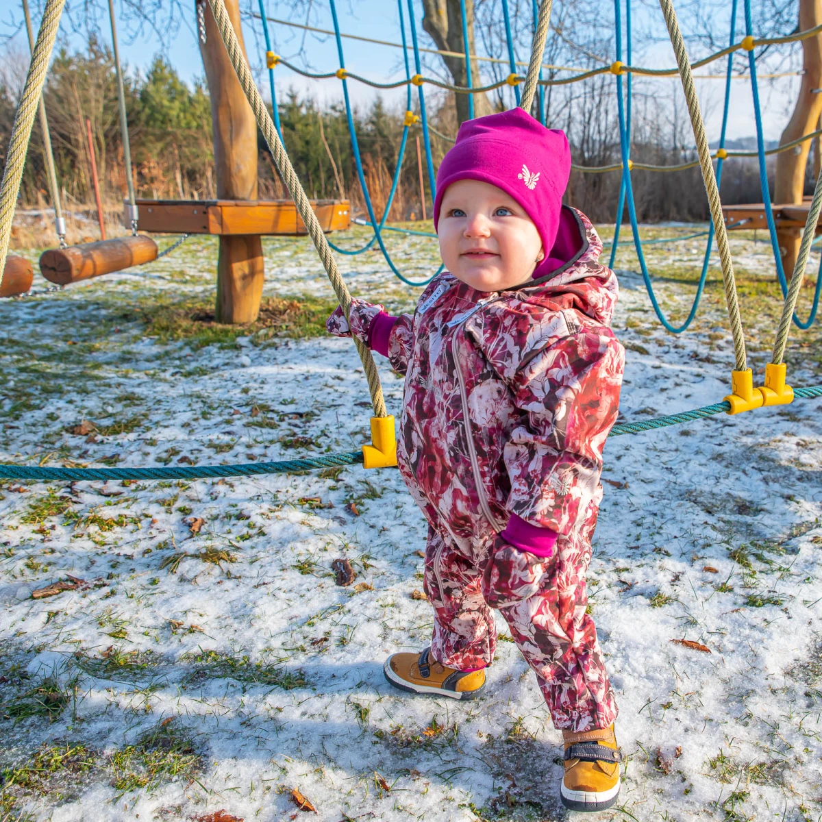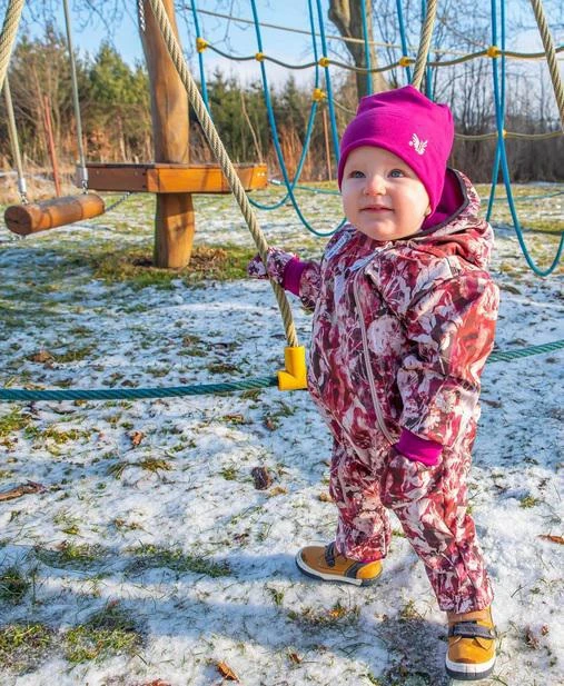 - Volný střih overalu pro volný pohyb při objevování světa. Materiál je jedinečně měkký a pružný nejen okolo zápěstí a nožiček.