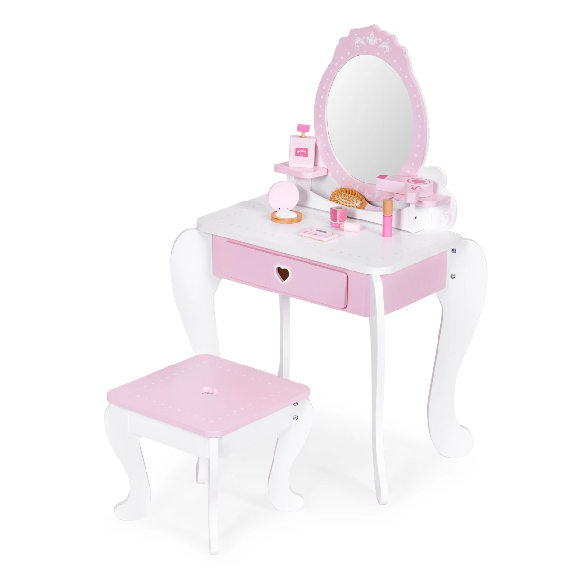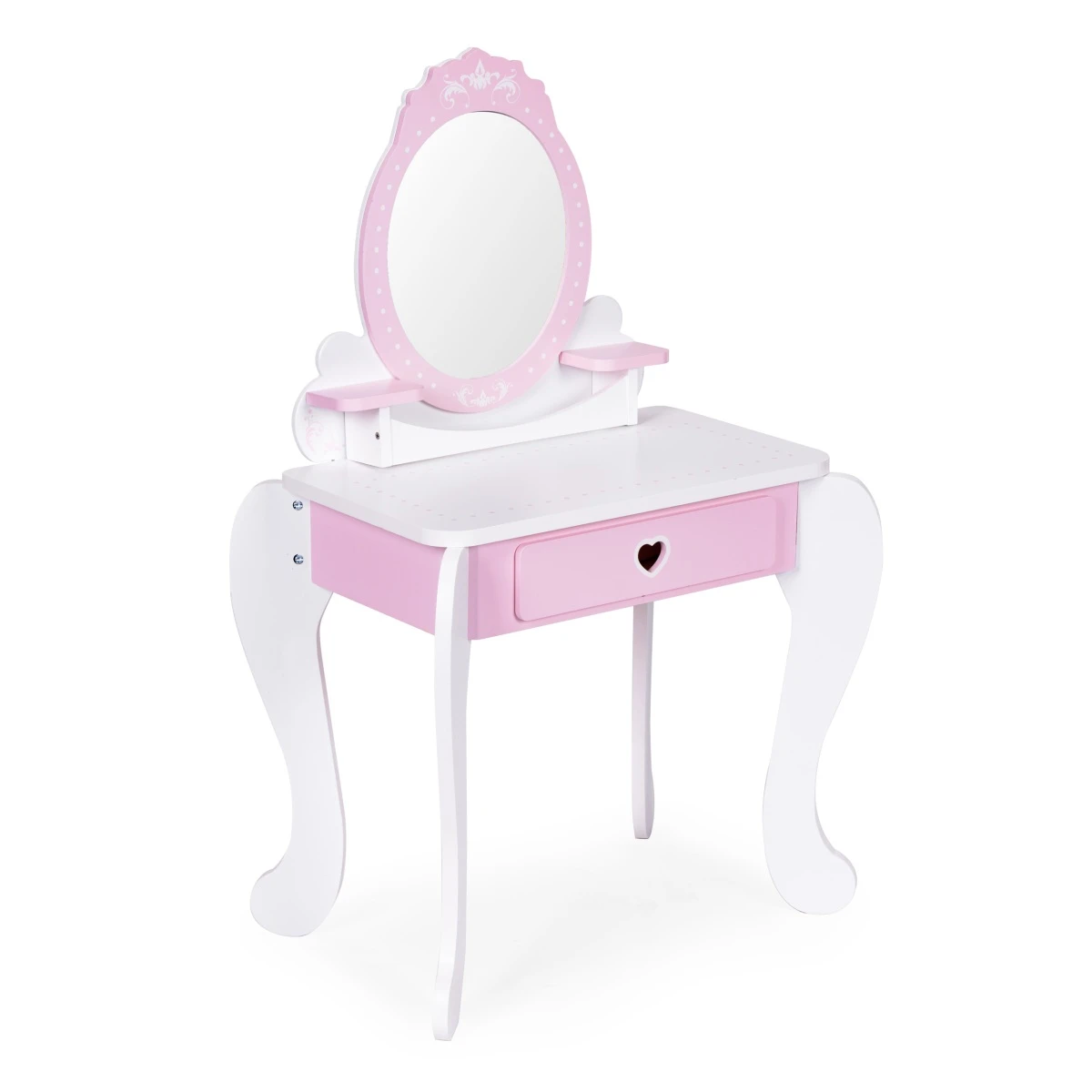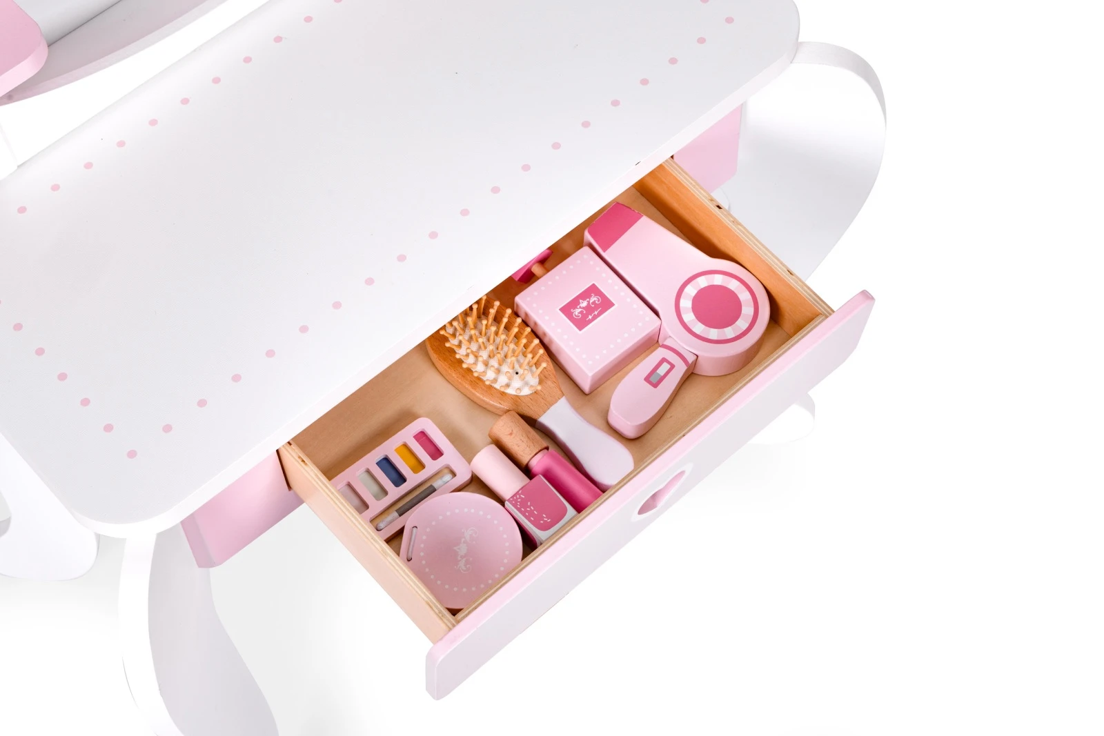 Tato dětská toaletka je navržena tak, aby holčičky mohly napodobovat své maminky při každodenních kosmetických rituálech. Díky realistickým doplňkům a ozdobnému, velkému zrcadlu splní sen každé malé vizážistky. Při hře si dítě rozvíjí jemnou motoriku a představivost a získá příležitost poznat základy líčení. Skvělá volba, pokud hledáte toaletní stolek pro děti a kvalitní dřevěnou toaletku pro holčičky.