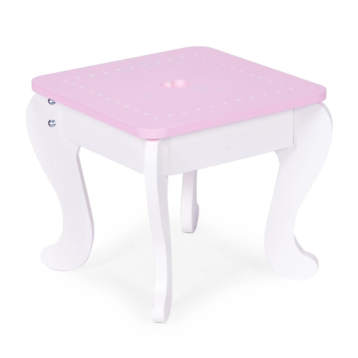 Stolička přizpůsobená výšce dítěte s výškou 26,5 cm zajistí pohodlné sezení při líčení nebo péči. Nábytek je sladěn s toaletkou tak, aby společně tvořily stylovou sadu.