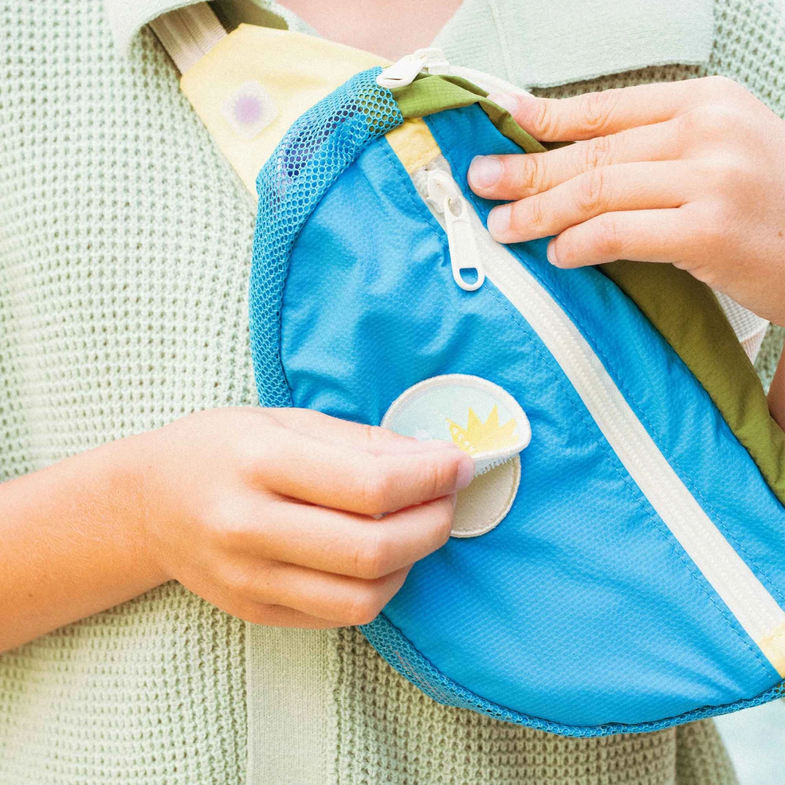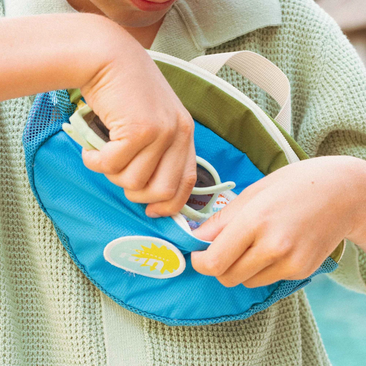 Hlavní kapsa ledvinky je síťovaná, což pomáhá odvádět písek a vlhkost. Uvnitř kapsy se nachází štítek na jméno dítěte, který usnadní identifikaci.