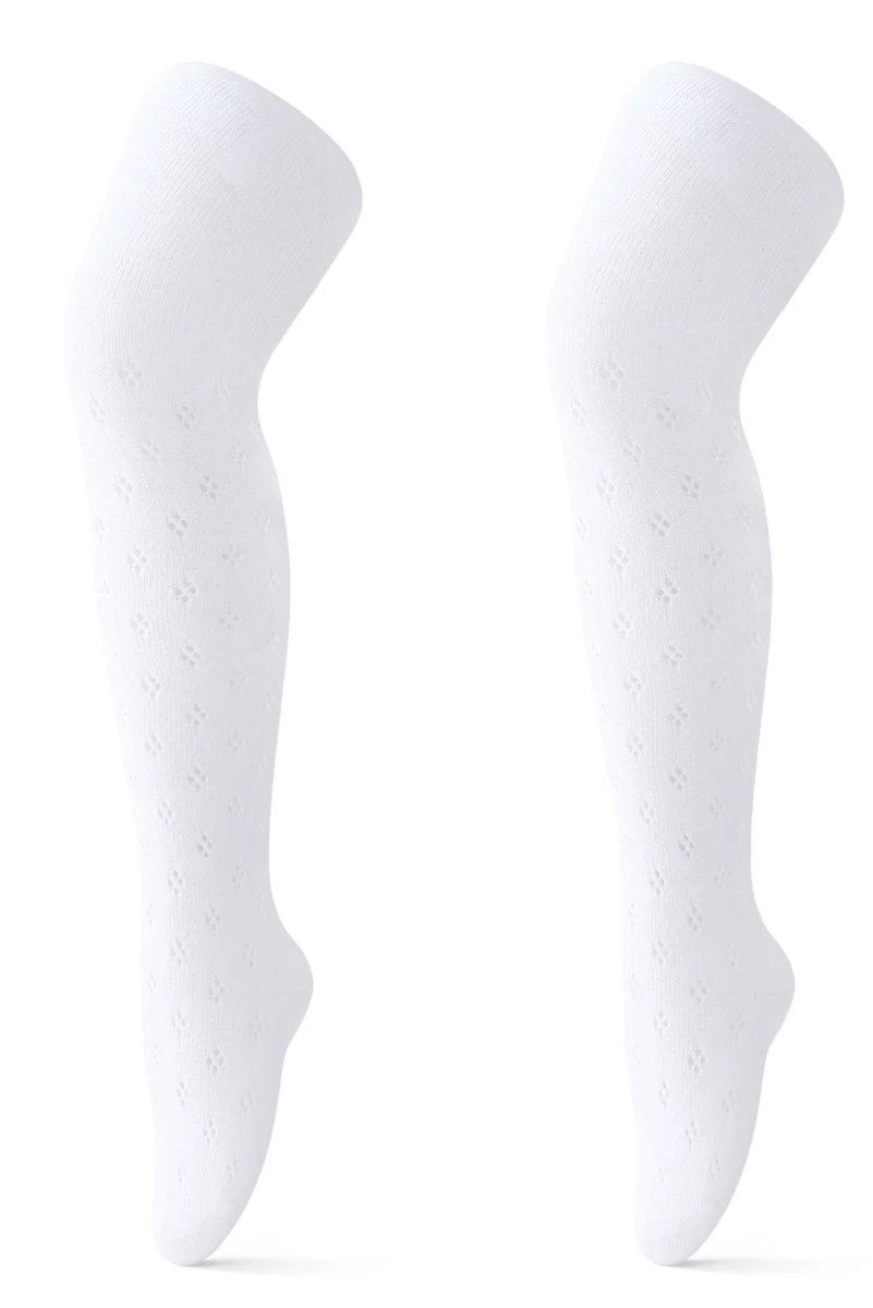 Elegantní dětské ažurové punčocháče v bílé barvě jsou ideální volbou pro slavnostní příležitosti. Jemný děrovaný vzor působí něžně a slavnostně, krásně doplní šaty i sukýnku a dodá outfitu výjimečný vzhled.
