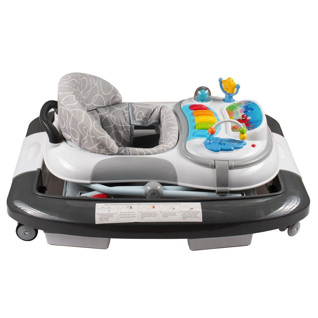 Dětské chodítko s houpačkou NEW BABY v moderním designu se čtyřmi kolečky a šesti bezpečnostními podložkami pomáhá dítěti se stabilitou při chůzi a zároveň přináší svět zábavy díky hracímu pultíku a možnosti jednoduché přestavby na houpačku. Interaktivní hrací pultík obsahuje různé hračky, piánko a 3D barevný obrázek mořského světa, vydává zvuky, svítí a lze jej vyjmout pro přístup k jídelnímu pultu. Chodítko je nastavitelné do několika poloh a má velice pohodlný potah, který lze vyprat a je v zadní části vyztužený. Vyrobeno z kvalitního plastového materiálu.
