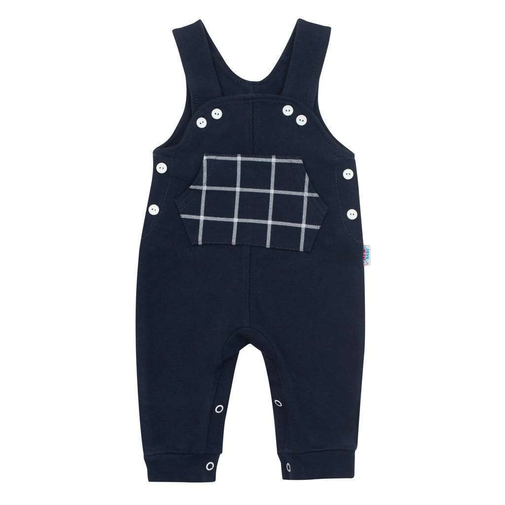 Bavlněné dětské lacláčky české značky New Baby Cool s moderním designem. Dětské lacláče mají na přední straně hlubokou kapsu a na nohavičkách mají pružný lem. Zapínají se na ramínkách na knoflíky a na cvočky mezi nožičkami, což je velmi praktické při oblékání.
