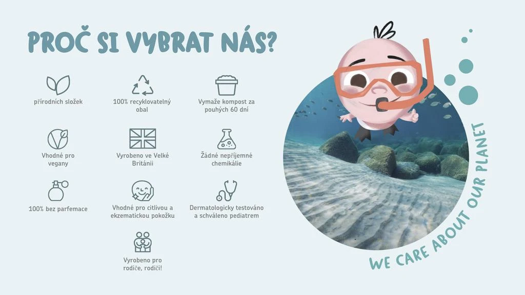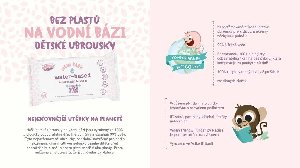 Jsou přírodní (99,9% ingrediencí pochází z rostlinné produkce - včetně obalového materiálu), jemné a vysoce účinné pro citlivou pokožku Vašeho dítěte, mají vyvážené PH (dermatologicky testováno, hypoalergenní). Vhodné pro ruce, tvář i tělo.