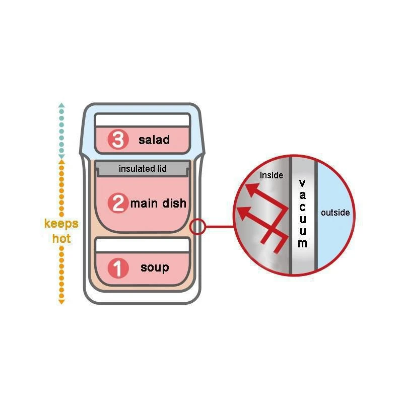 - Jídlonosič pro děti se skládá ze tří oddělených nádob, které se vkládají do nerezového vakuově izolovaného těla jídlonosiče. Spodní nádoba je určena na polévku, prostřední nádoba na hlavní jídlo (např. rýže, těstoviny) a horní nádoba na salát či přílohu. Spodní dvě nádoby jsou tepelně izolovány. Horní nádoba je bez tepelné izolace. Všechny tři nádoby jsou vyrobeny z kvalitního BPA free materiálu. Nádoby je možné vložit do mikrovlnné trouby či do myčky na nádobí. Jídlonosič je doplněn o pouzdro s popruhem pro snadné nošení.