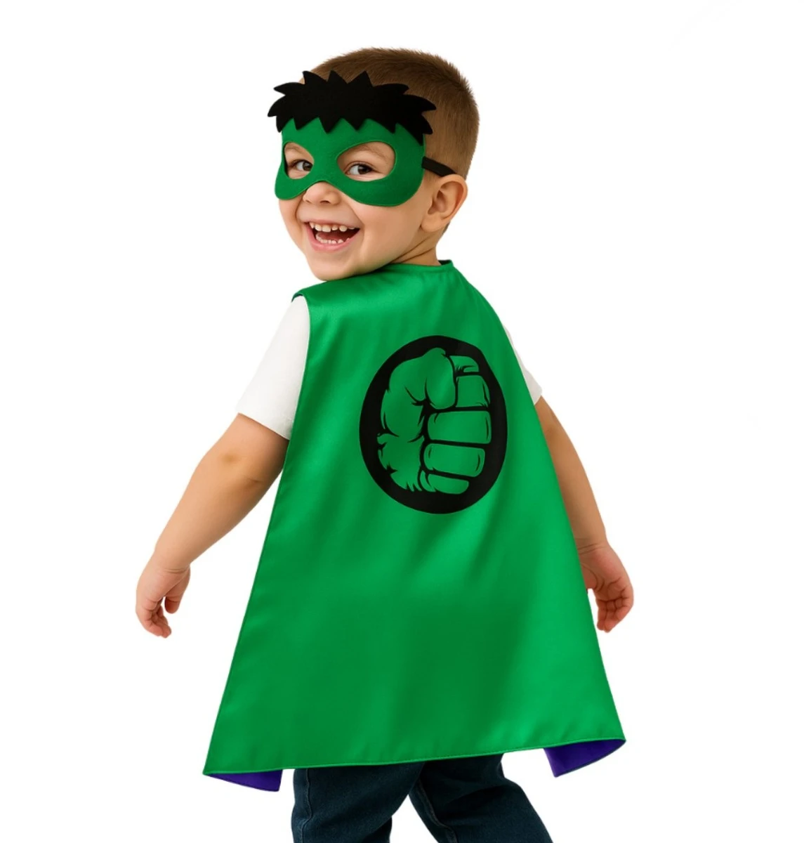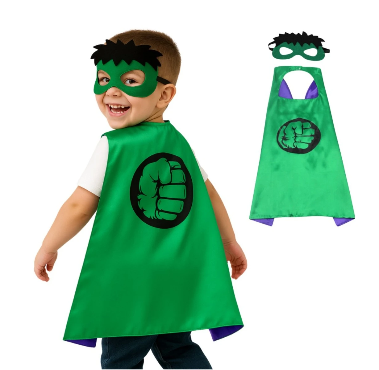 Tento stylový set se skládá z lesklého zeleného pláště s ikonickým motivem pěstě Hulka a doplňkové masky s černými vlasy a zeleným okrajem kolem očí. Děti se během okamžiku promění v neohroženého Avengera a stanou se hvězdou každého karnevalu nebo narozeninové oslavy.