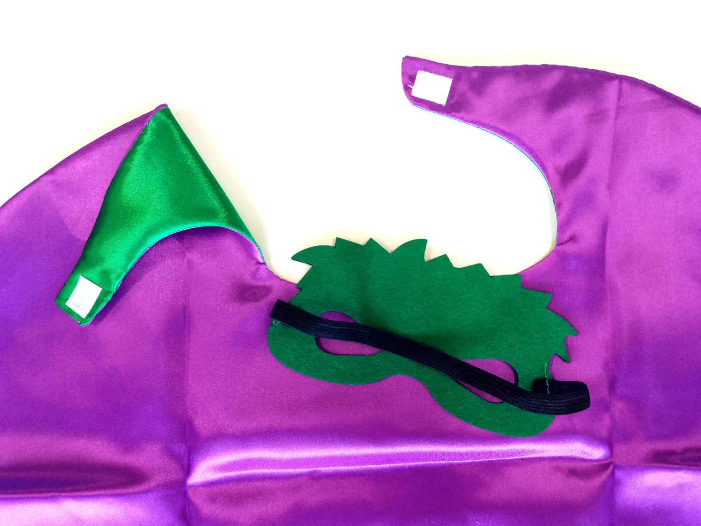 Plášť je vyroben z jemného, lehkého a lesklého polyesteru, který se příjemně nosí a snadno se obléká díky praktickému zapínání za krkem. Vnitřní strana pláště je v kontrastní fialové barvě, což dodává kostýmu ještě víc stylu a připomíná originální barevné schéma slavného superhrdiny.