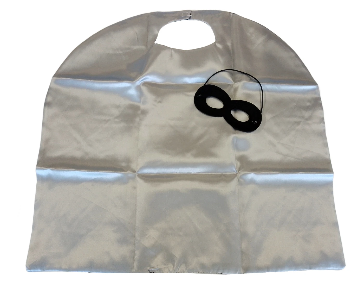 Plášť je vyroben z lehkého a hladkého saténového materiálu, příjemného na nošení, a při pohybu krásně vlaje. Je oboustranný s vnitřní stříbrnou stranou a zapínáním na suchý zip za krkem, což umožňuje snadné oblékání. Maska je z měkkého materiálu s pružnou gumičkou, která dobře drží na hlavě a neškrtí.