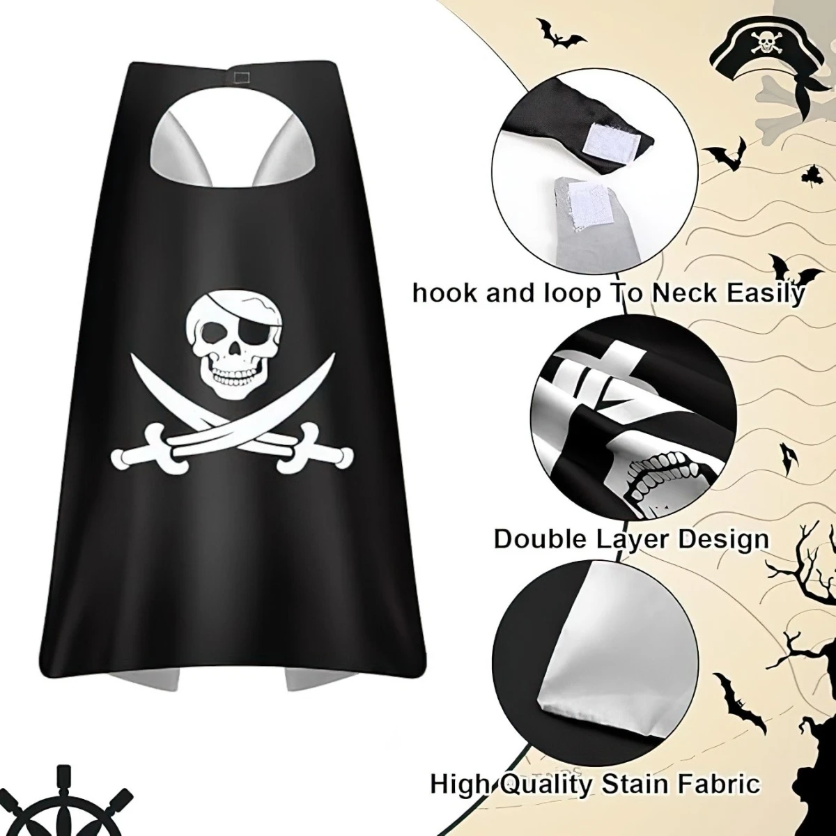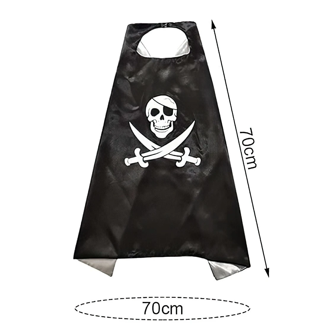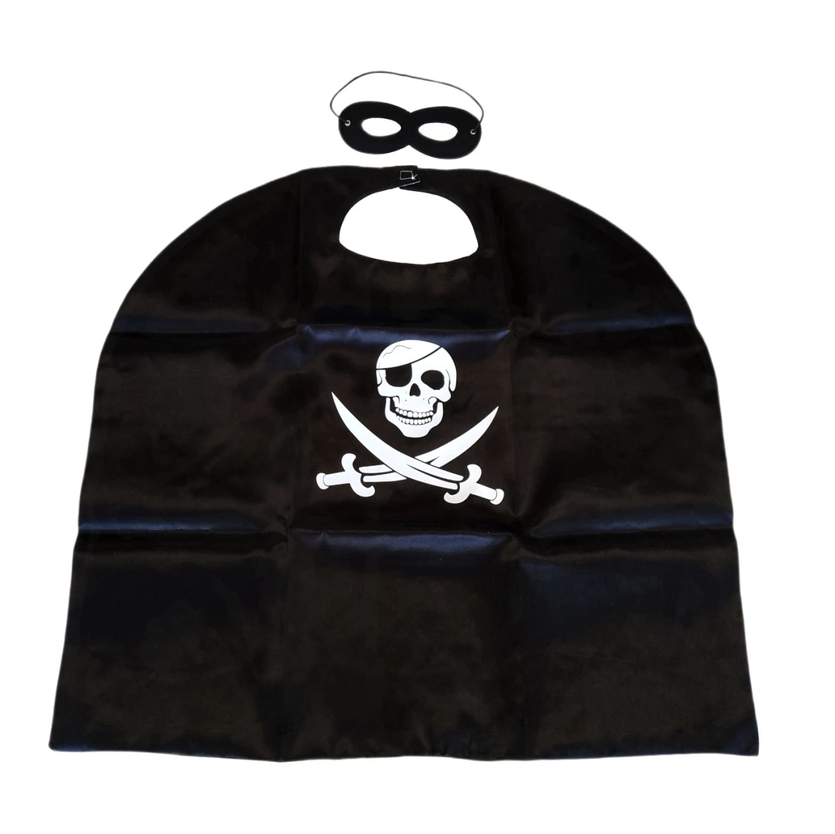 Sada zahrnuje černý plášť s klasickým pirártským symbolem lebky a zkřížených mečů a černou masku na oči pro autentický pirártský vzhled.