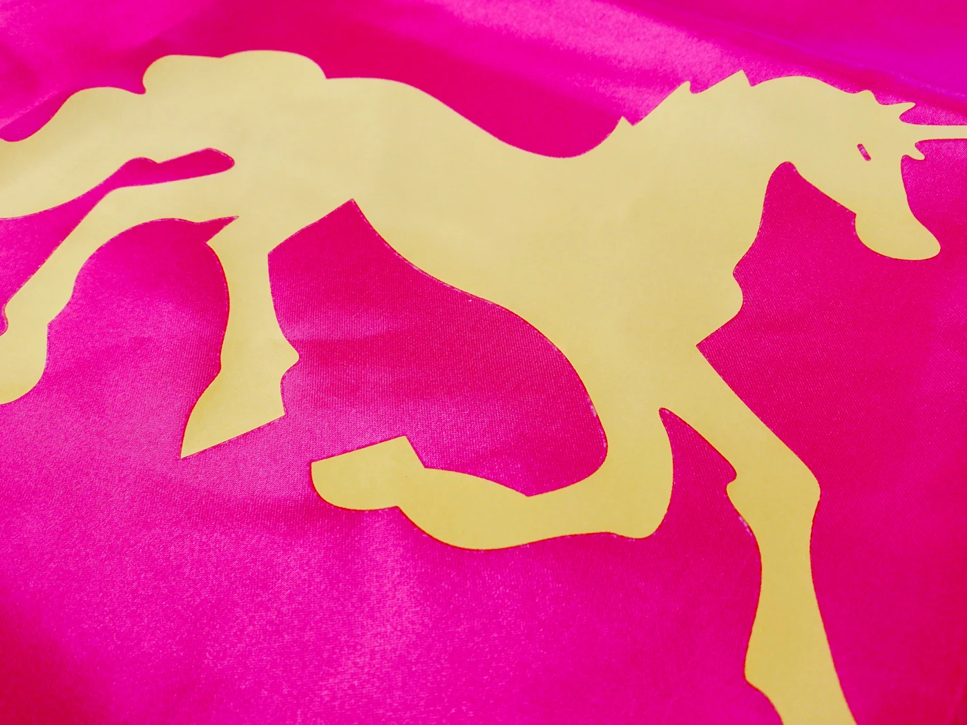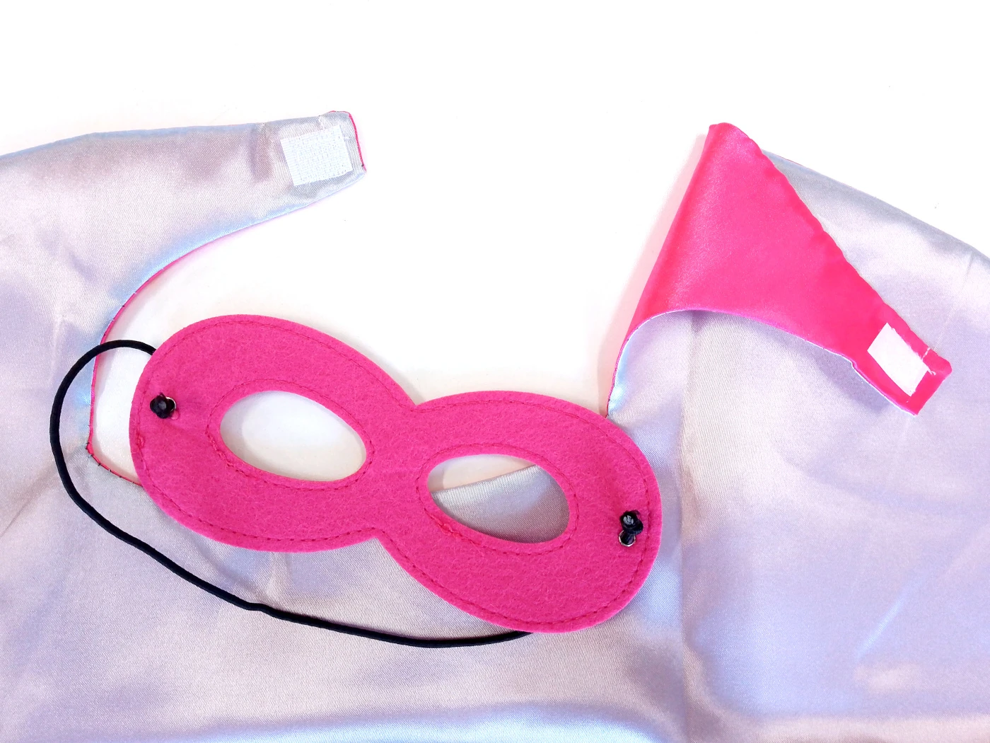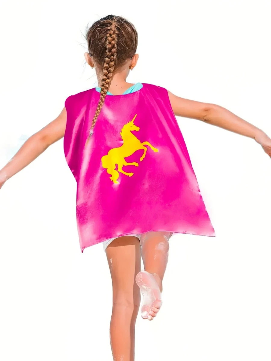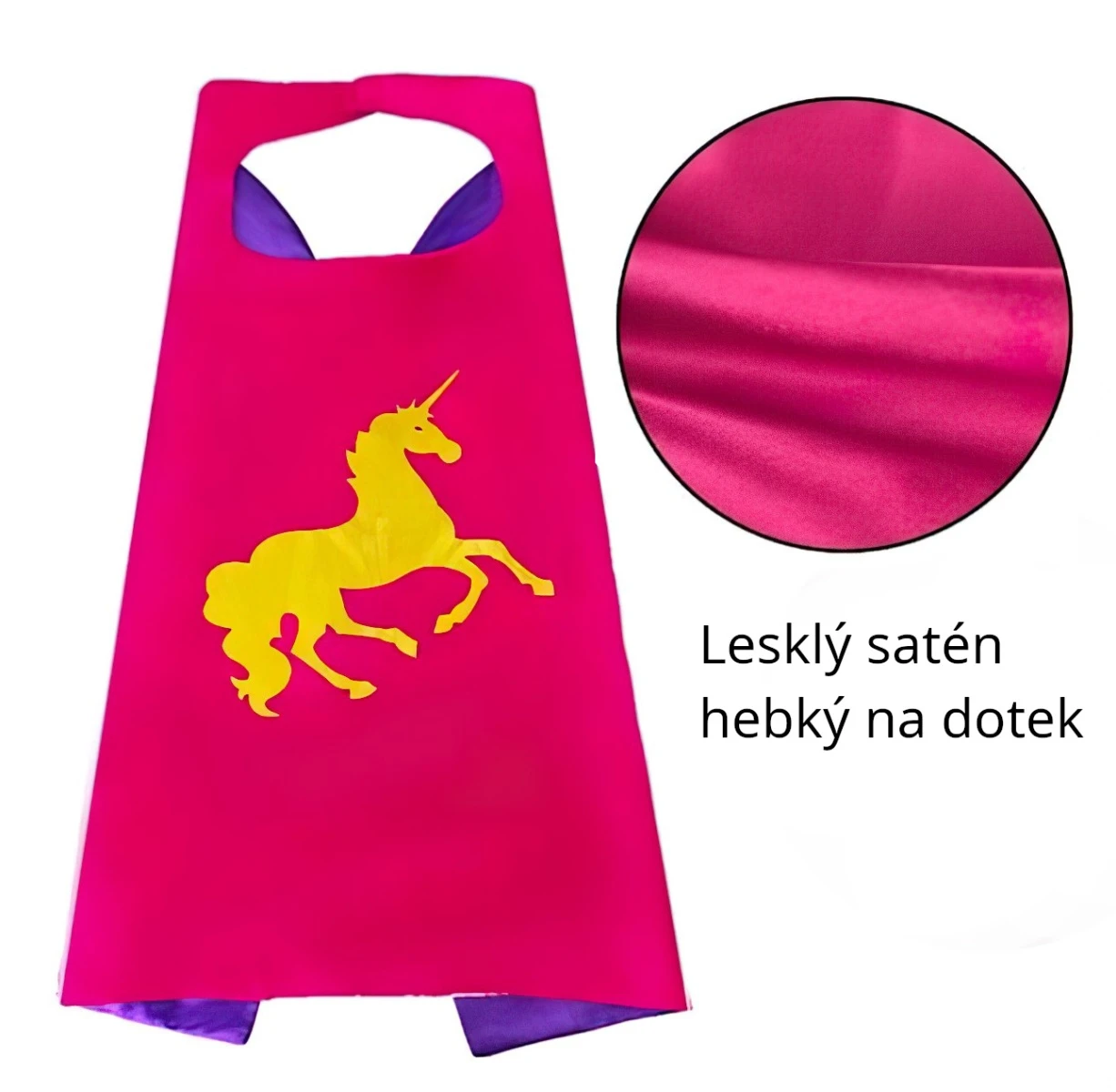Plášť v sytě růžové barvě zdobí velký zlatý jednorožec, který působí elegantně a hravě zároveň. Součástí balení je také maska ve stejné barevné kombinaci, díky níž se dítě snadno převtělí do tajemné pohádkové bytosti.