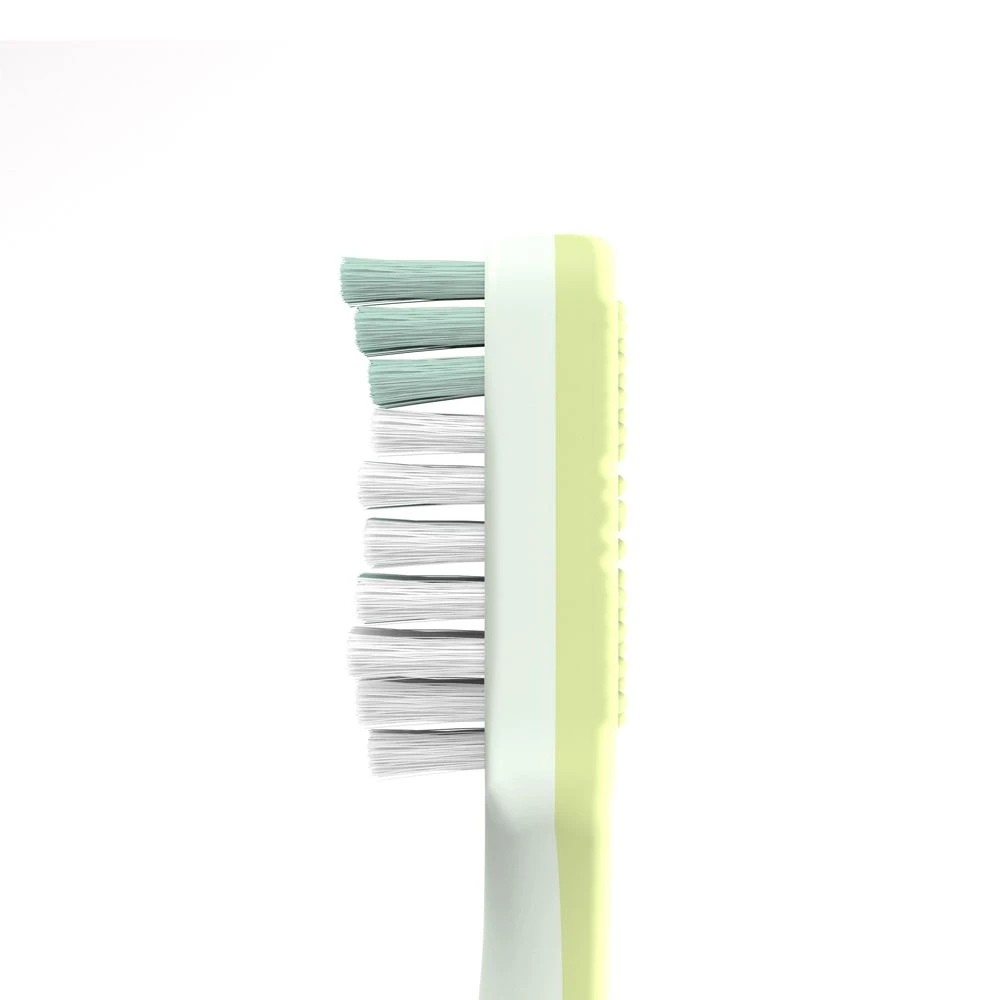 - Má měkké štětinky uspořádané do tvaru „Z“, které lépe dosáhnou do těžko dostupných míst. Barevné označení na štětinkách pomáhá rodičům snadno dávkovat správné množství zubní pasty – velikosti hrášku