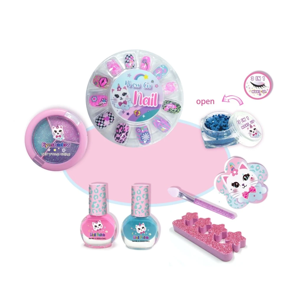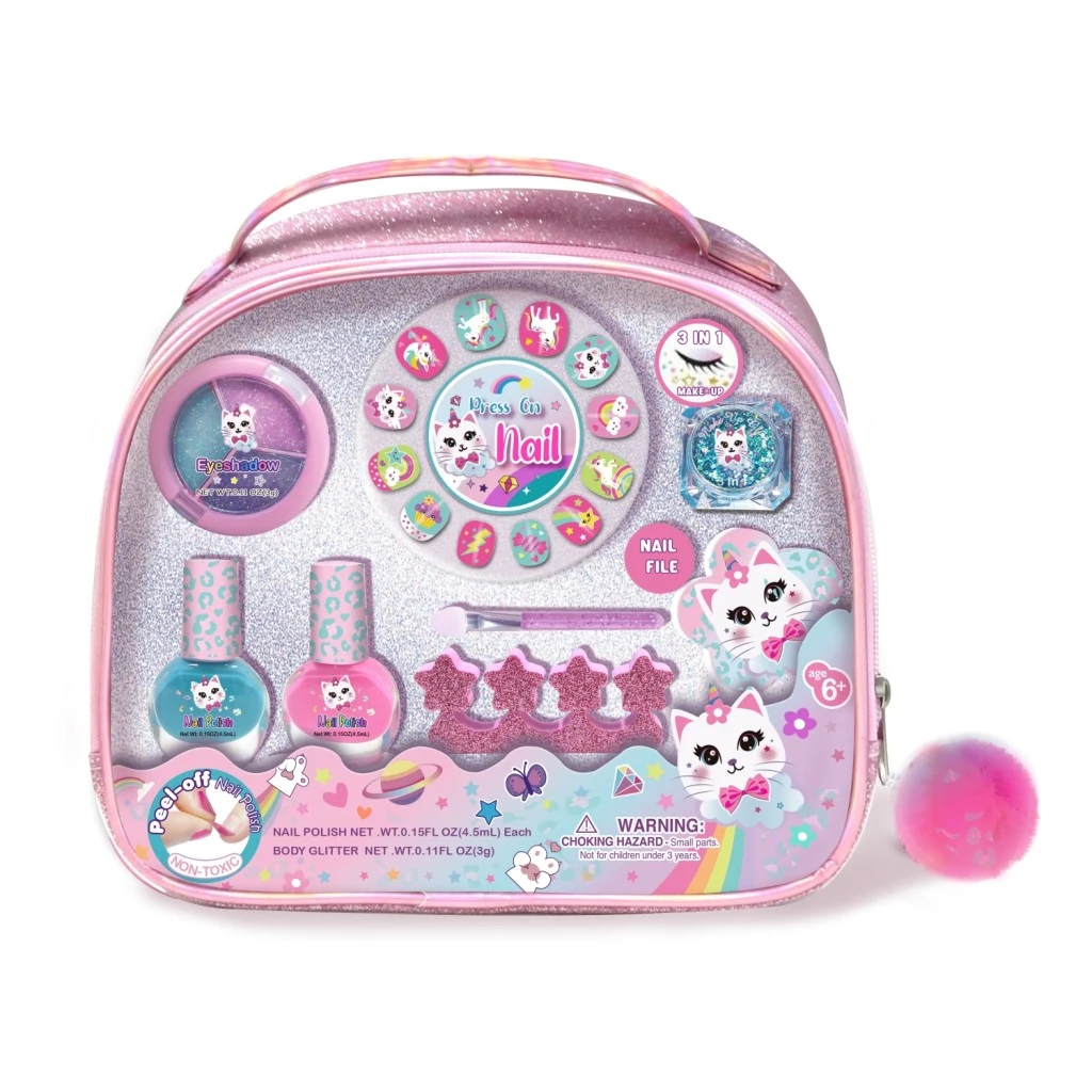 Dětský kosmetický set s taškou na zip a přívěškem. V balení najdete třpytky na tělo a obličej, nalepovací barevné nehty, oční stíny, pilníček na nehty, 2 laky na nehty, odělovač prstů pro lakování nehtů.
