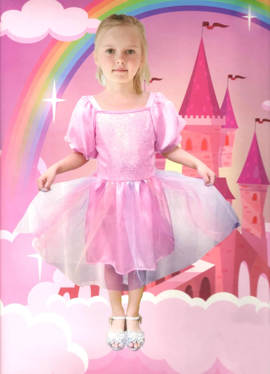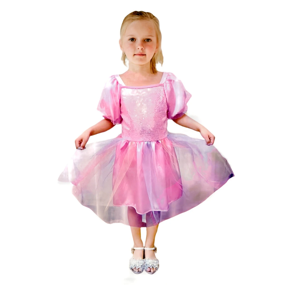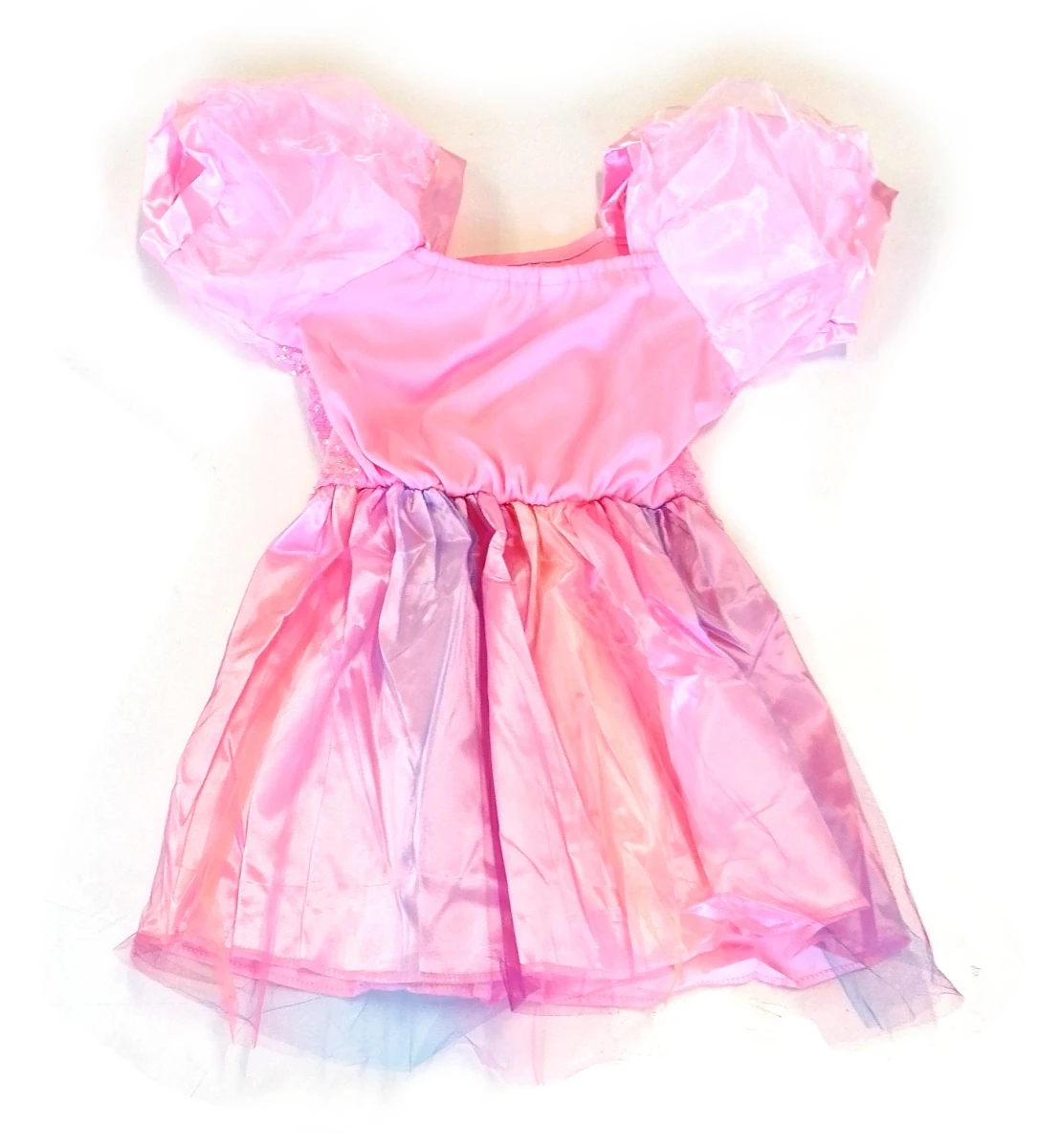 Kostým se skládá z růžových šatů s třpytivým živůtkem a nadýchanými krátkými rukávky. Sukně je bohatě vrstvená, tvořená kombinací saténu a lehkého tylu v růžových a fialových odstínech, které při pohybu krásně vyniknou. Celý vzhled působí lehce a elegantně, zároveň však zůstává pohodlný a hravý.