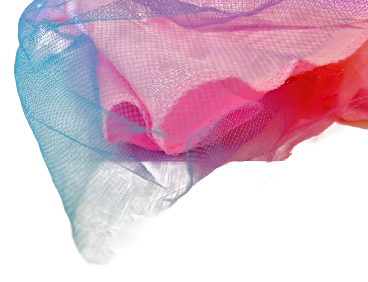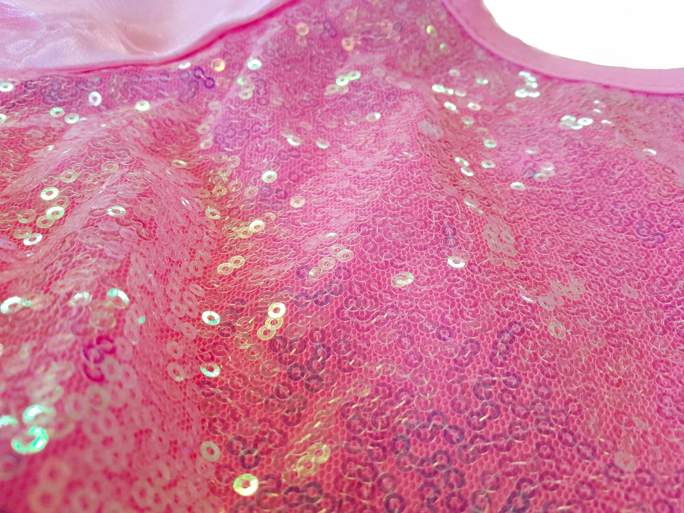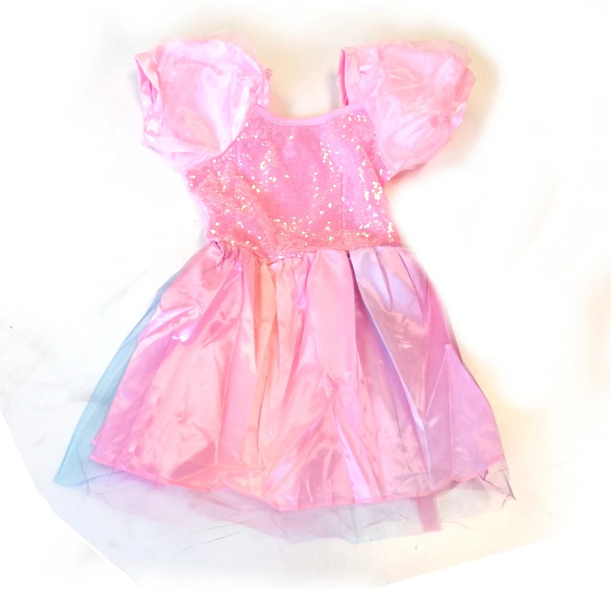 Kostým se skládá z růžových šatů s třpytivým živůtkem a nadýchanými krátkými rukávky. Sukně je bohatě vrstvená, tvořená kombinací saténu a lehkého tylu v růžových a fialových odstínech, které při pohybu krásně vyniknou. Celý vzhled působí lehce a elegantně, zároveň však zůstává pohodlný a hravý.