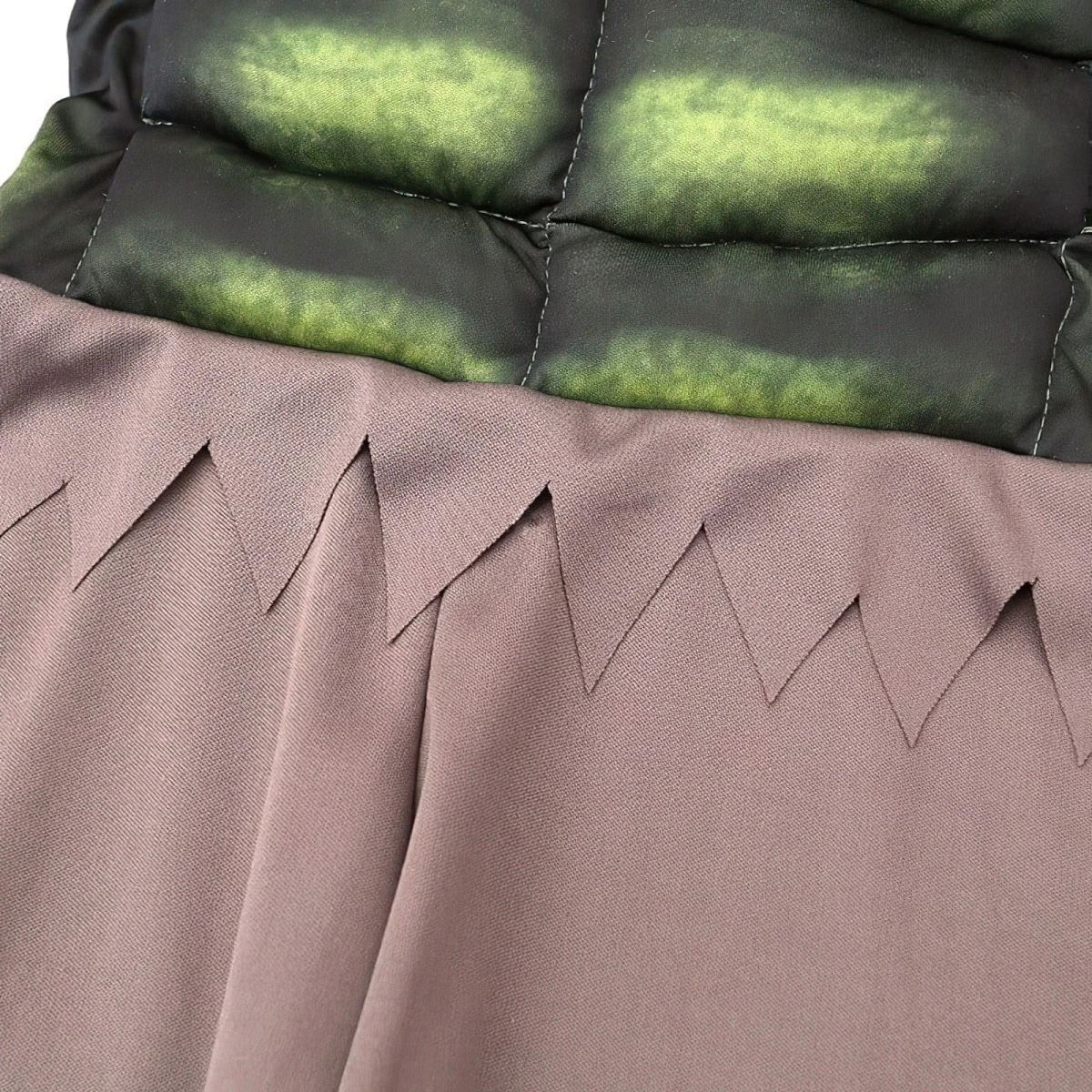 Horní díl kostýmu je vyroben z měkkého polyesterového materiálu s vypodloženými „svaly“, které dodávají postavě mohutnost a sílu, přesně jako u Hulka. Kalhoty mají zubatý okraj, což připomíná roztržené oblečení po Hulkově proměně. Kostým je lehký, prodyšný a pohodlný na nošení po celý den.