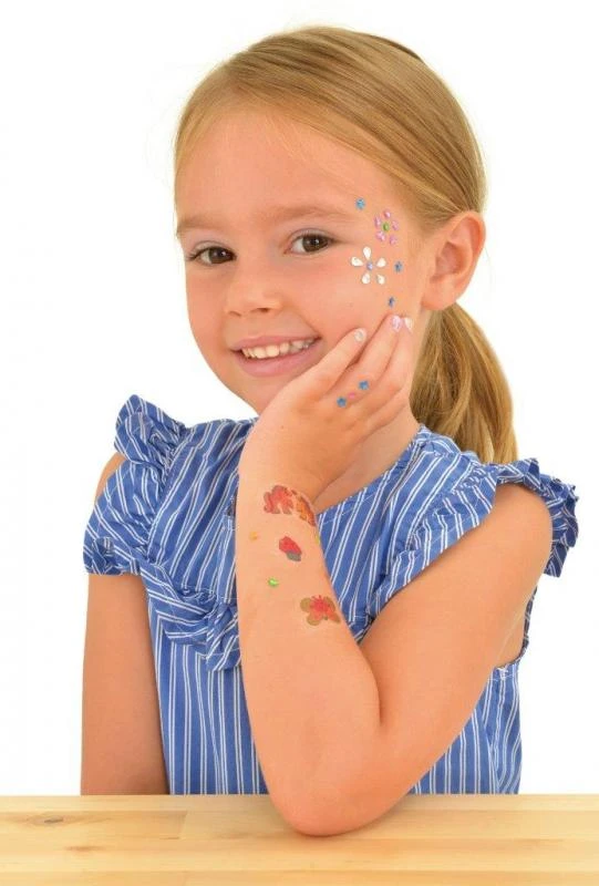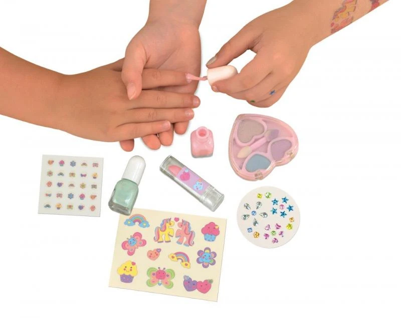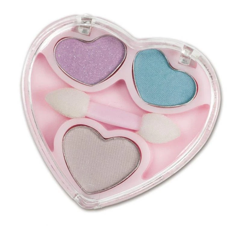 Obsah: 3 oční stíny s aplikátorem v krabičce ve tvaru srdce, minirtěnka, 2 laky na nehty, tetování, nalepovací kamínky, samolepky na nehty a návod.
