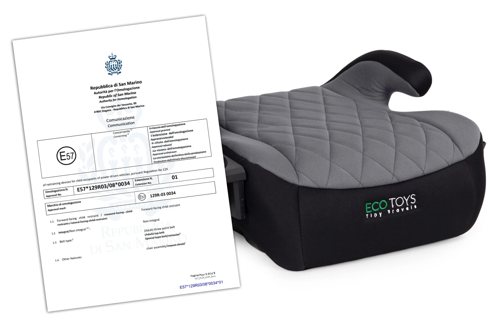 Podsedák do auta ECOTOYS splňuje nejnovější evropské bezpečnostní standardy dle regulace i-Size (ECE R129/03). Tato norma, vytvořená pro dosažení maximální bezpečnosti dětí při cestování autem, klade přísné požadavky na výrobky včetně testů nárazů.