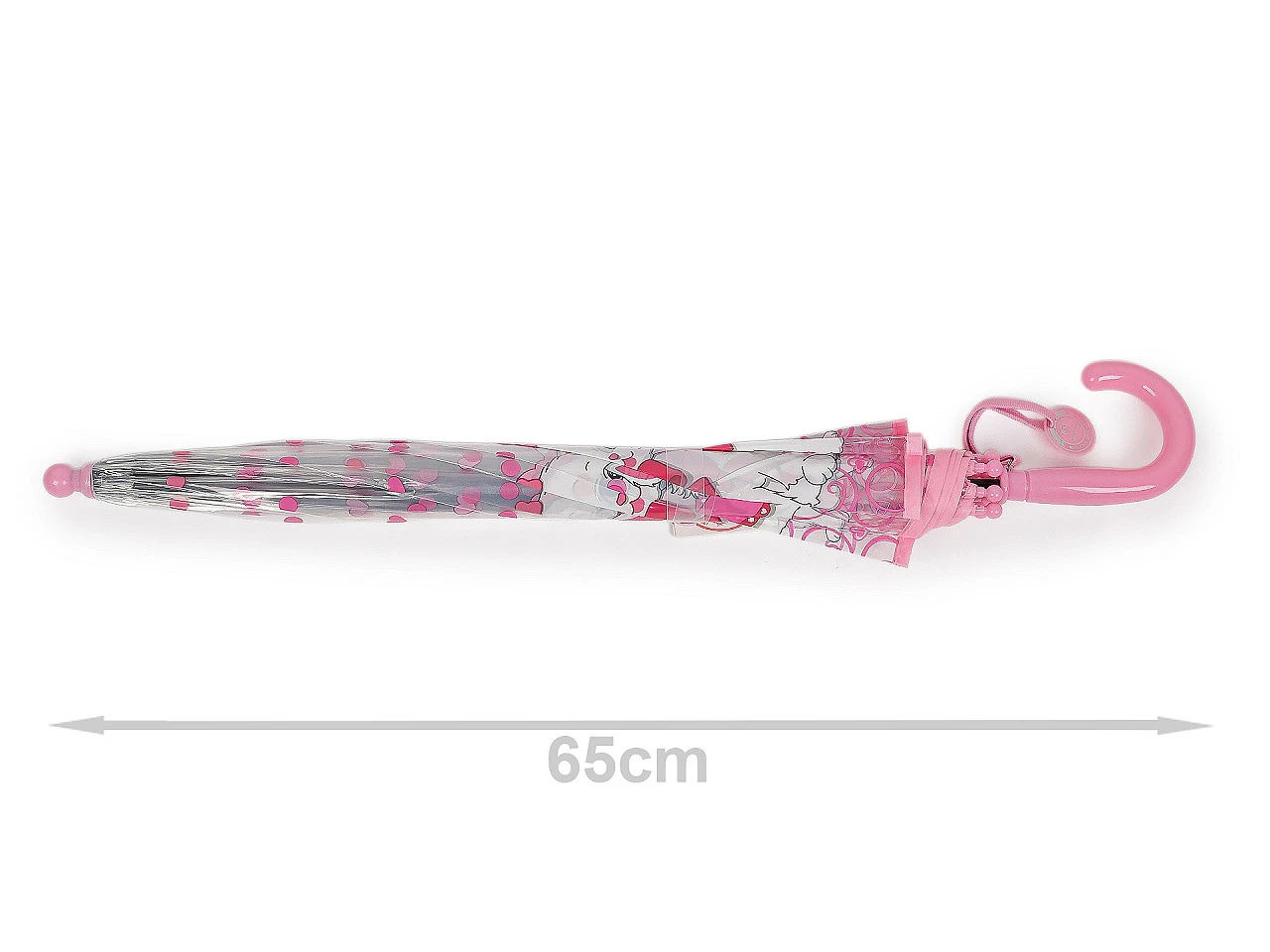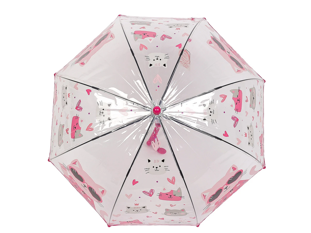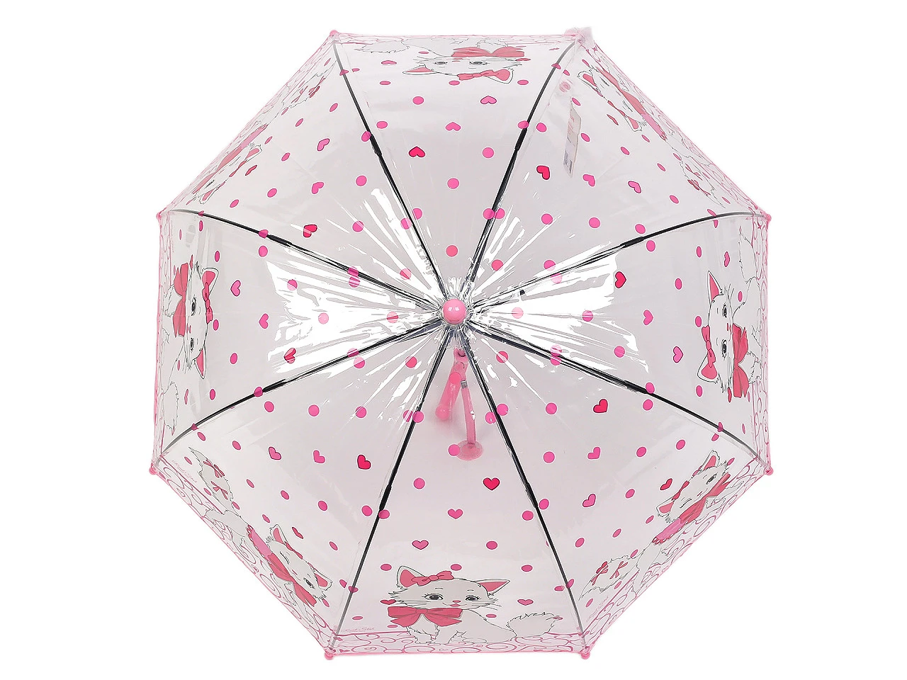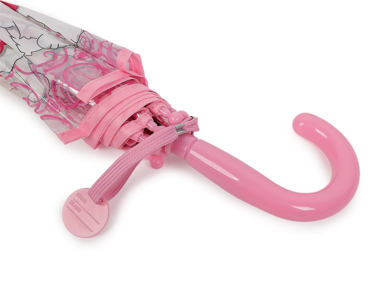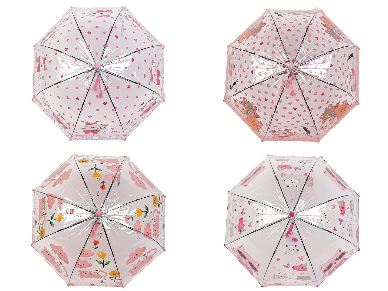 Průhledný materiál nejen že zajišťuje skvělou viditelnost, ale také dodává veselý a hravý vzhled, který si vaše dítě okamžitě oblíbí. Díky hluboké konstrukci poskytuje zvýšenou ochranu proti větru a dešti, zatímco vystřelovací mechanismus umožňuje snadné a rychlé otevření. Deštník má klasickou tyč zakončenou pevnou rukojetí s visačkou, na kterou můžete napsat jméno dítěte. Konstrukce deštníku je z pružných lamel a tvoří osm polí.