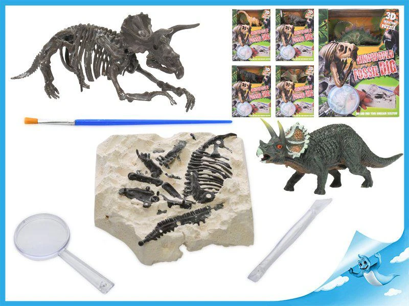 Dinosaurus 12 cm a zkamenělina v sádře s dlátem, lupou a štětcem