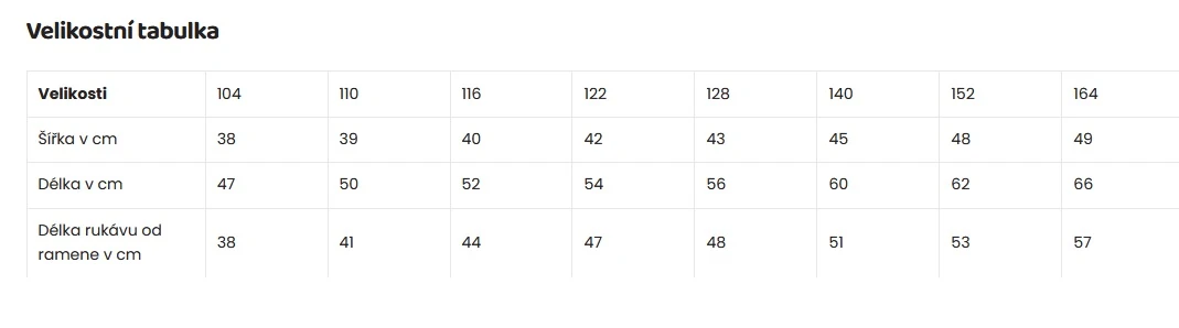 | Velikost | 104 / 110 / 116 / 122 / 128 / 140 / 152 / 164 |