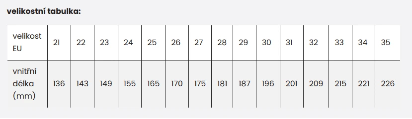 Velikost EU 21 odpovídá vnitřní délce boty 136 mm.