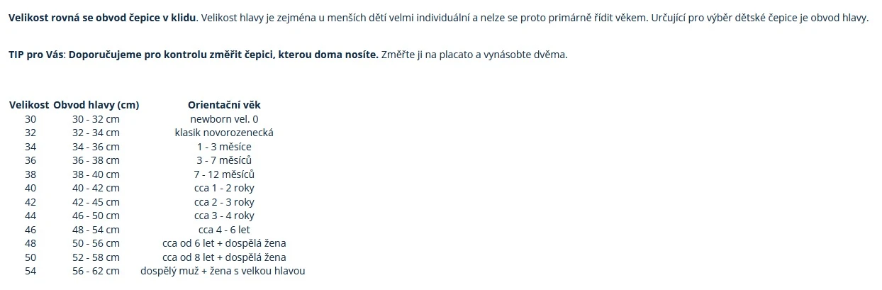 Důležité: U dětí nelze určit velikost podle věku, každé dítě je jedinečné!