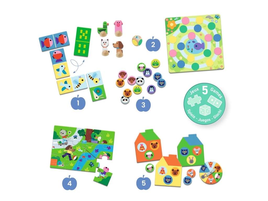 Tahle bohatá sada obsahuje 5 klasických vzdělávacích her pro nejmenší – děti si hrají a přitom nenápadně rozvíjejí paměť, logické myšlení i pozorovací schopnosti. Najdou tu puzzle, domino, loto, pexeso i zábavnou hru s kostkou. Roztomilé ilustrace zvířátek z farmy udělají radost každému malému hráči. Ideální pro první společné hraní a učení se pravidlům.