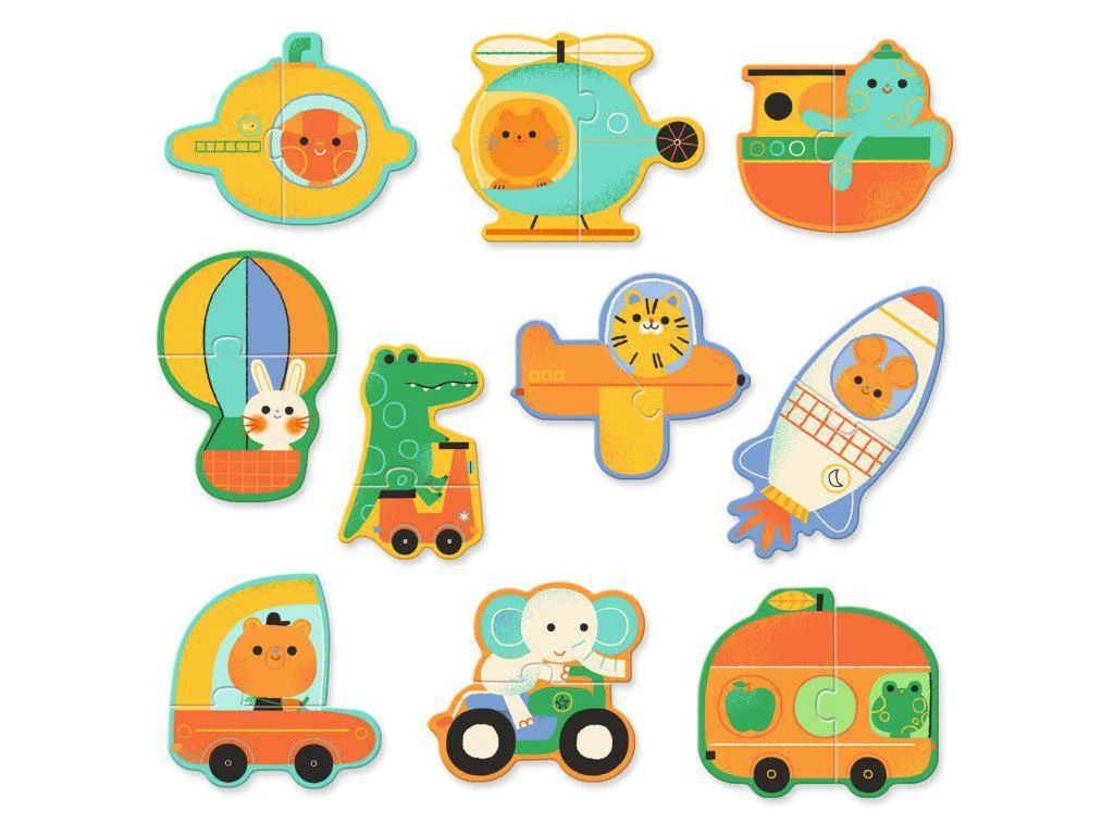 Vzdělávací puzzle na téma dopravních prostředků pro nejmenší děti od 2 let. Dítě skládá 2 dílky vozidla, které řídí roztomilé zvířátko.