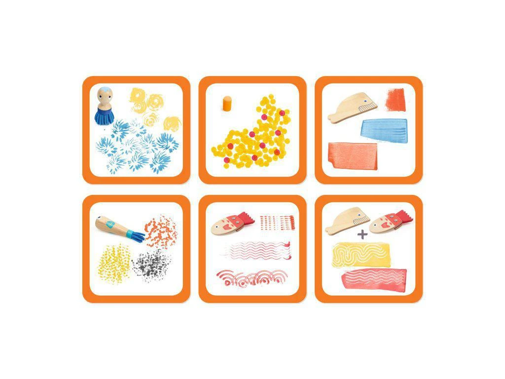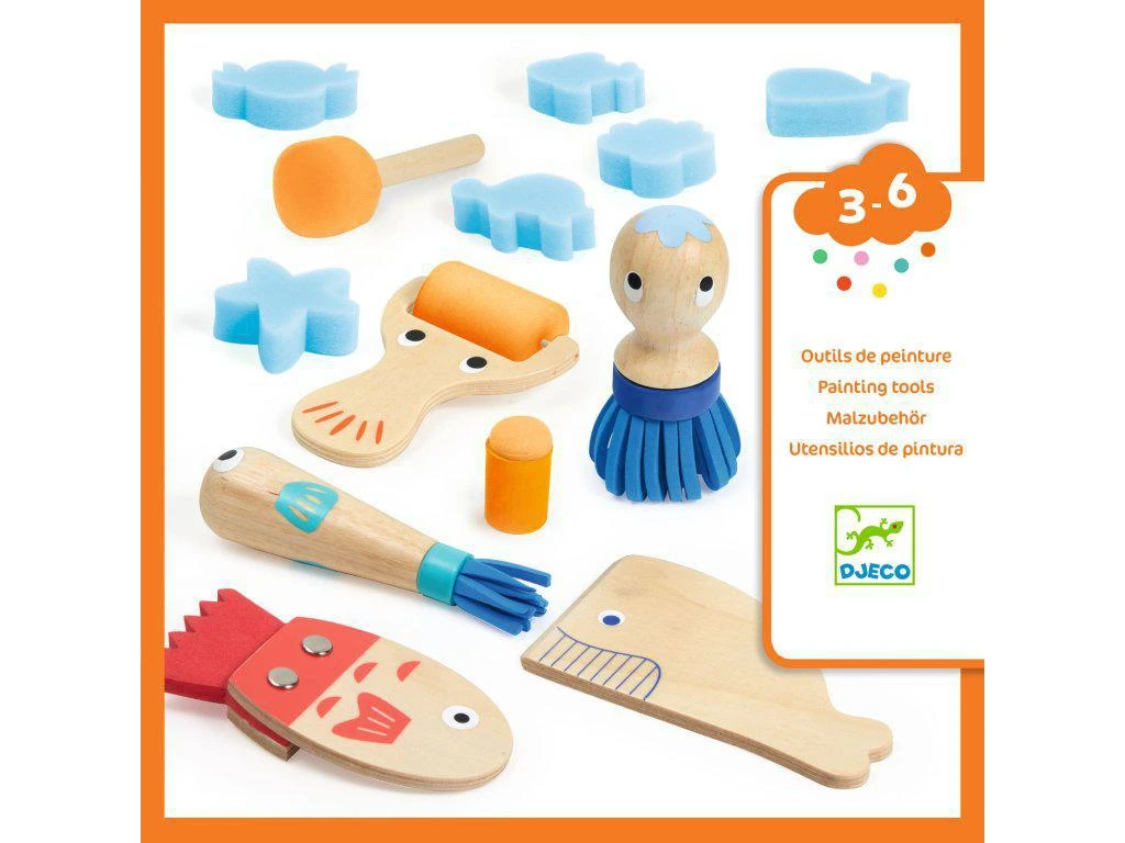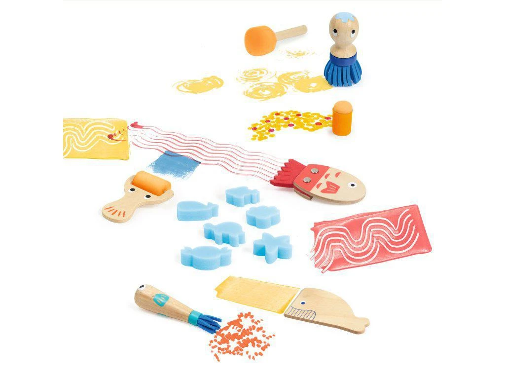 S těmito výtvarnými potřebami si děti vyzkouší spoustu nových způsobů malování a vytvoří tak jedinečné obrázky. Sada obsahuje 6 dřevěných malovacích potřeb, 6 houbiček a 10 kartiček s instrukcemi, jak malovací pomůcky využít. Veškeré nástroje jsou vyrobené tak, aby se dětem dobře držely a manipulace s nimi tak byla hračkou!