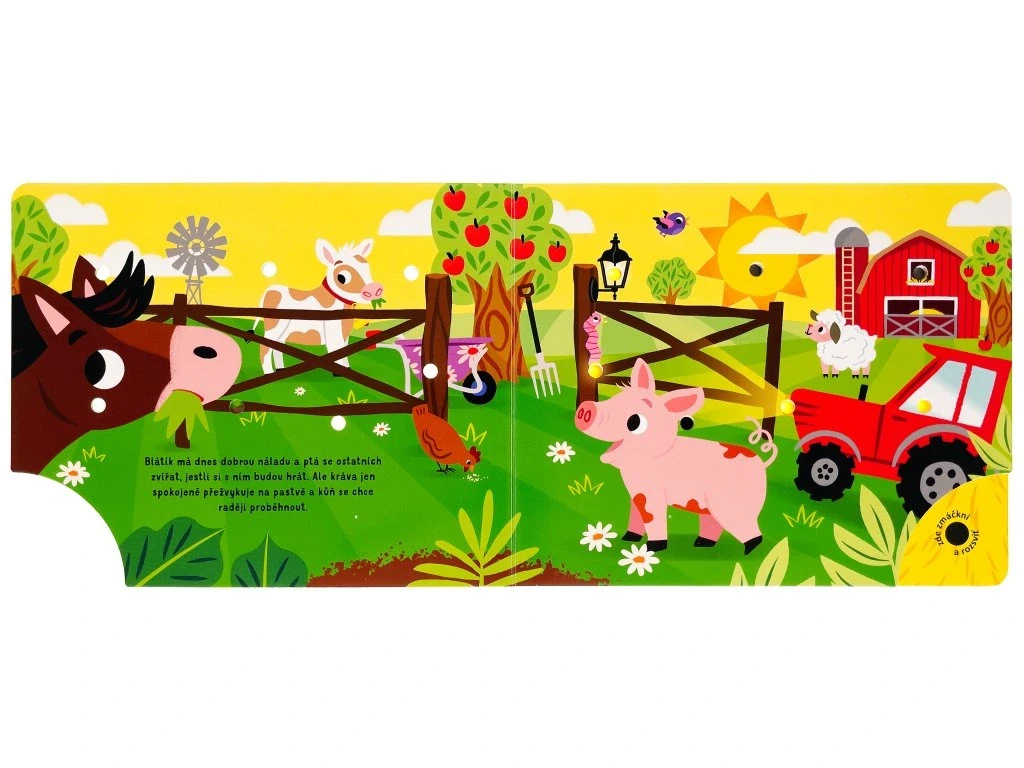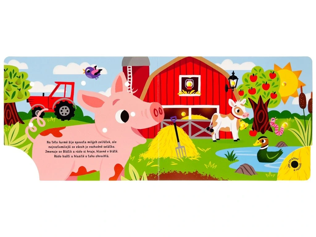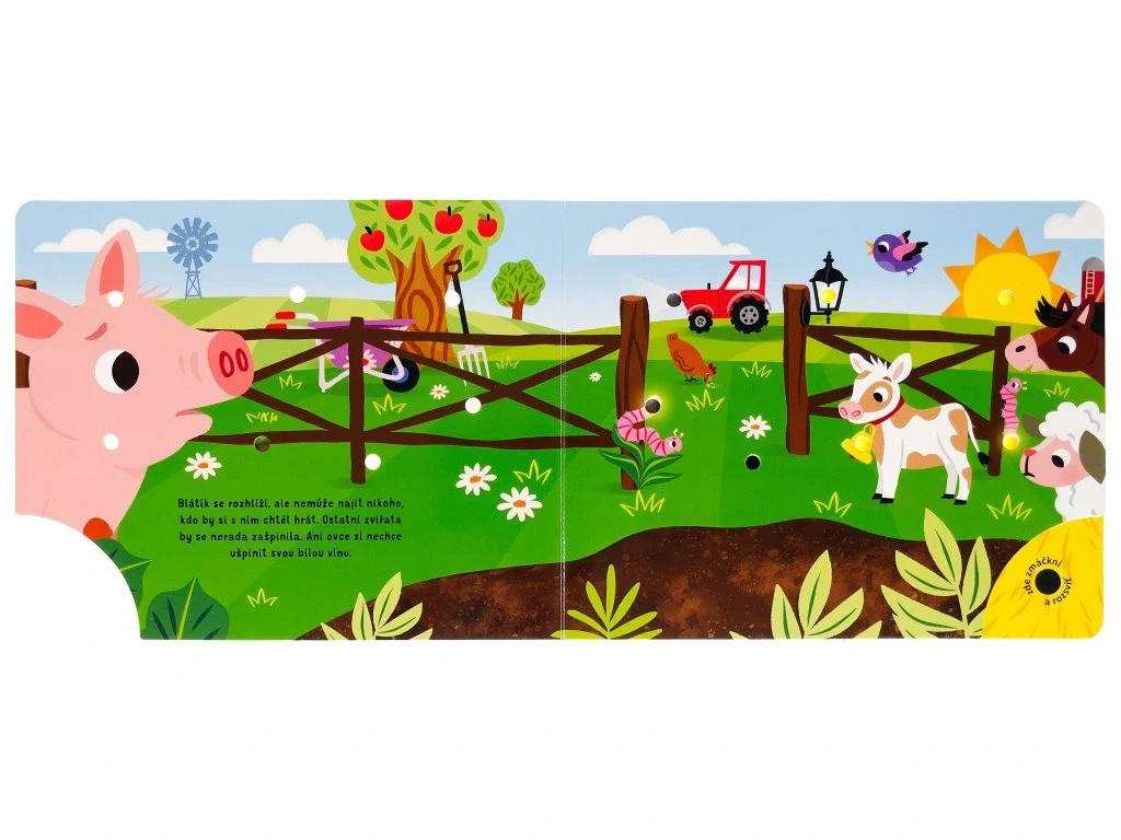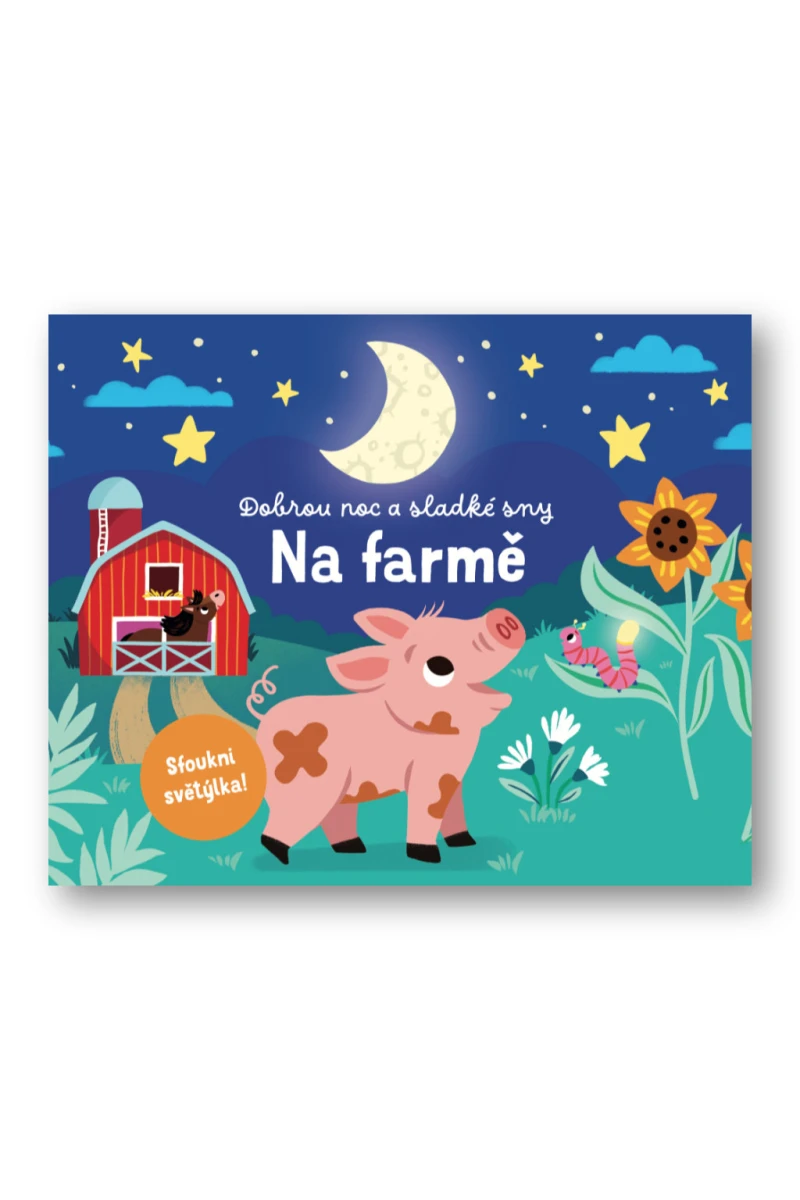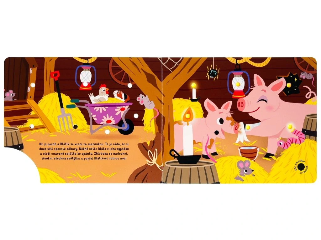 Prožijte den s jedním roztomilým selátkem na farmě v tomto leporelu se světýlky. Selátko si rádo hraje s ostatními zvířaty, ale po celém dni je unavené. Ulož ho do postýlky a fouknutím zhasni světýlka. Jak kniha funguje? Nejprve zmáčkni tlačítko v pravém dolním rohu a všechna světla na stránce se rozsvítí. Pak foukni do jediného otvoru, který nesvítí, a všechna světla zhasnou. Ideální knížka před spaním.