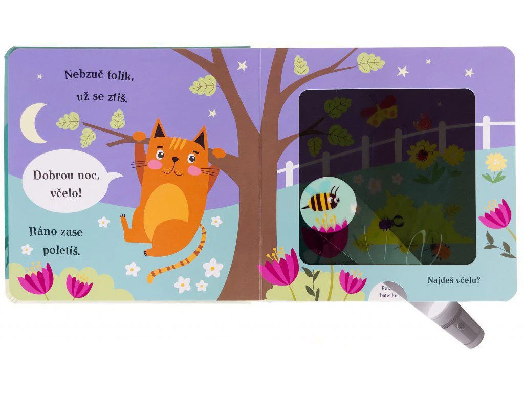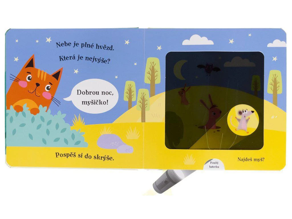 Kouzelné čtení na dobrou noc pro děti. Kočička už se chystá spát, ale nejprve musí dát dobrou noc všem svým zvířecím kamarádům. Pomůžeš jí je najít? Vsuň kouzelnou baterku mezi stránky a zjisti, kdo se ukrývá v každé ilustraci, zobrazující noc. Text ve verších učí děti vnímat přirozený rytmus řeči. Chytře vyrobená okénka umožňují dětem hledat schovaná zvířátka pomocí přiložené kartonové pomůcky ve tvaru svítilny. Nabídněte svému dítěti před spaním nějakou zklidňující aktivitu. Tato knížka je pro to přímo stvořená.