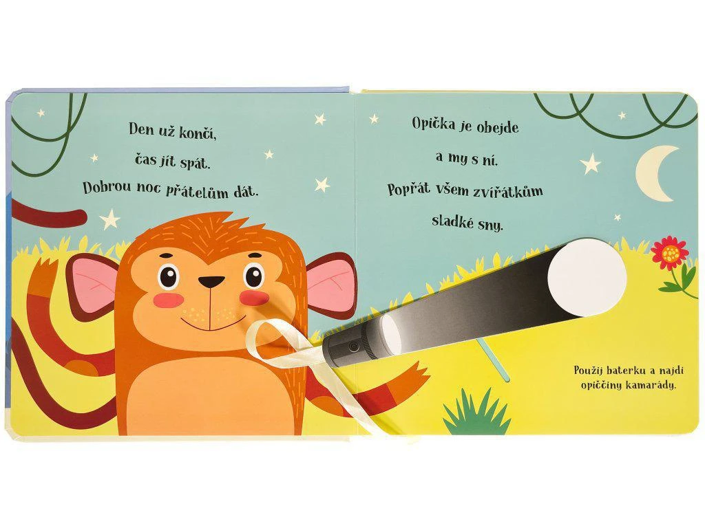 Kouzelné čtení na dobrou noc pro děti. Malá opička už se chystá spát, ale nejprve musí dát dobrou noc všem svým zvířecím kamarádům. Pomůžeš jí je najít? Vsuň kouzelnou baterku mezi stránky a zjisti, kdo se ukrývá v každé ilustraci, zobrazující noc. Text ve verších učí děti vnímat přirozený rytmus řeči. Chytře vyrobená okénka umožňují dětem hledat schovaná zvířátka pomocí přiložené kartonové pomůcky ve tvaru svítilny. Nabídněte svému dítěti před spaním nějakou zklidňující aktivitu. Tato knížka je pro to přímo stvořená.