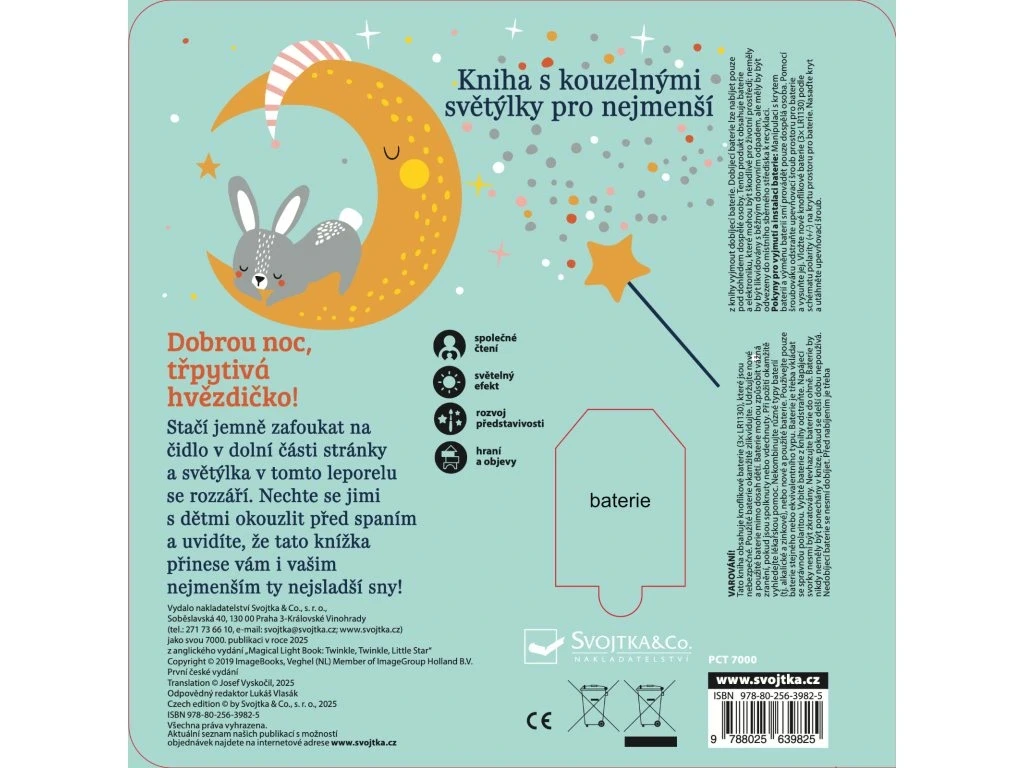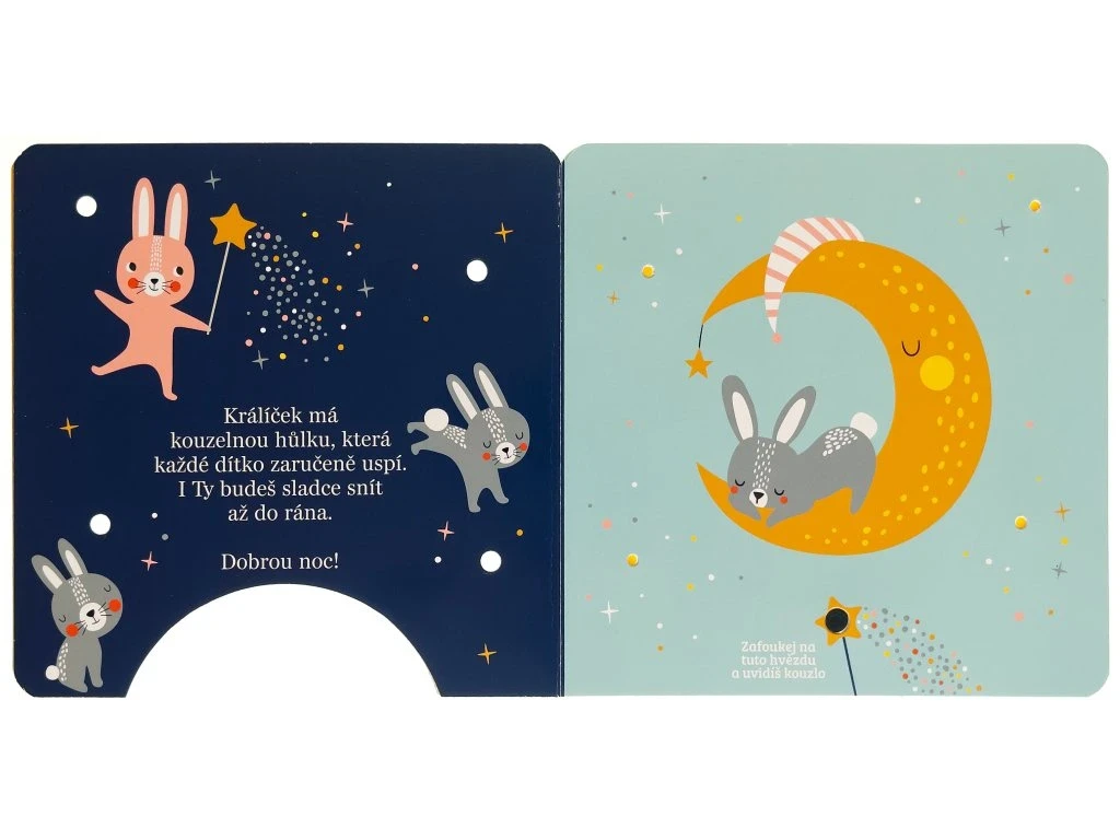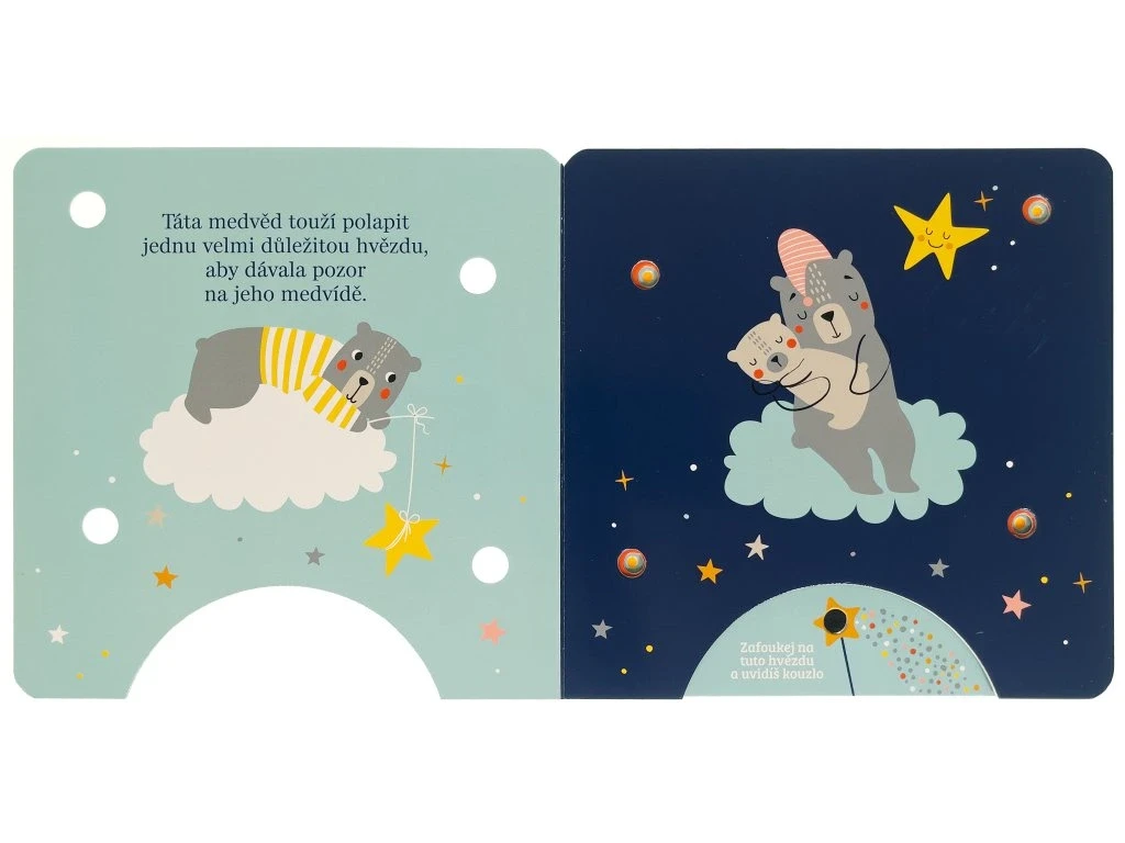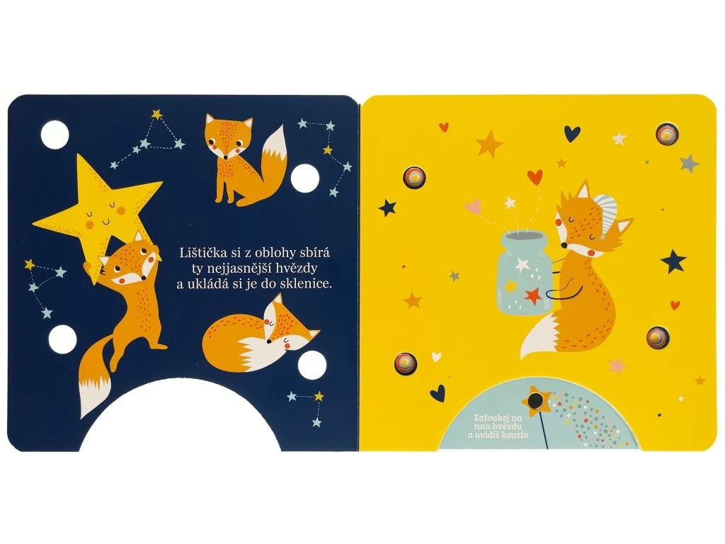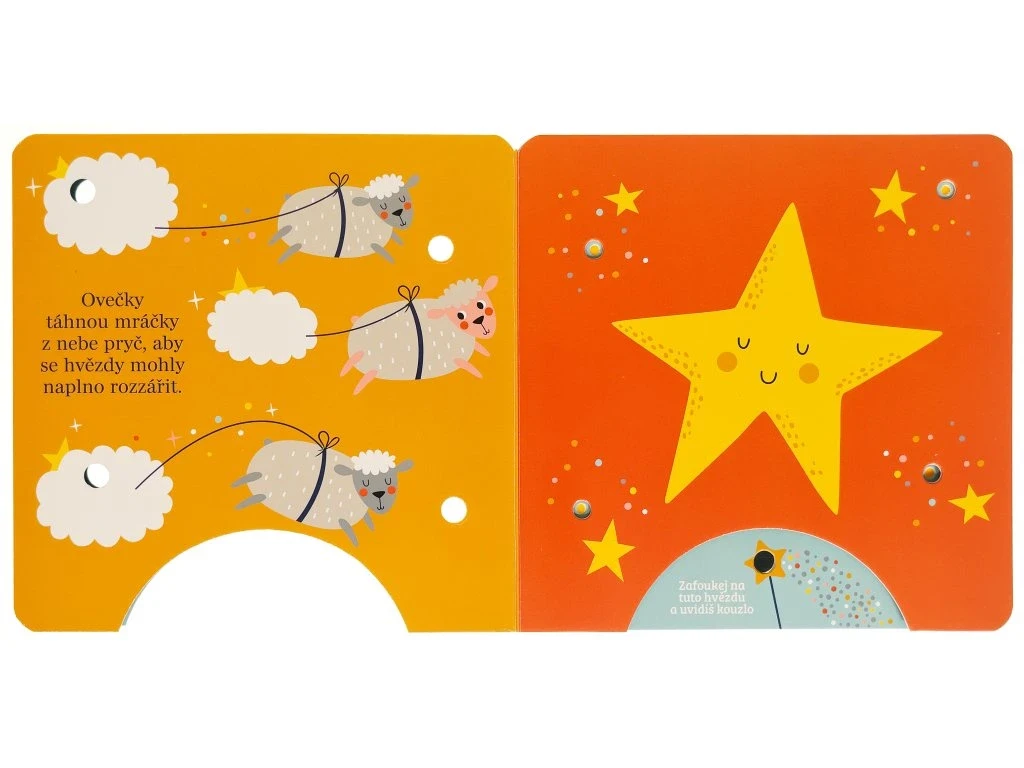Stačí jemně zafoukat na čidlo v dolní části knihy a na stránkách se rozzáří kouzelná světýlka! Toto okouzlující leporelo pro nejmenší děti provází před spaním lištička, medvídek, ovečky i králíček, kteří se starají o hvězdy na noční obloze. Krátké, něžné texty a světelné efekty vytvářejí atmosféru, ve které se děti snadno uklidní a připraví na spánek. Knížka rozvíjí představivost, podporuje společné čtení a díky interaktivnímu prvku "foukni a rozsviť" přináší dětem radost z objevování i pocit malého kouzla. Ideální večerní rituál pro ty nejsladší sny.