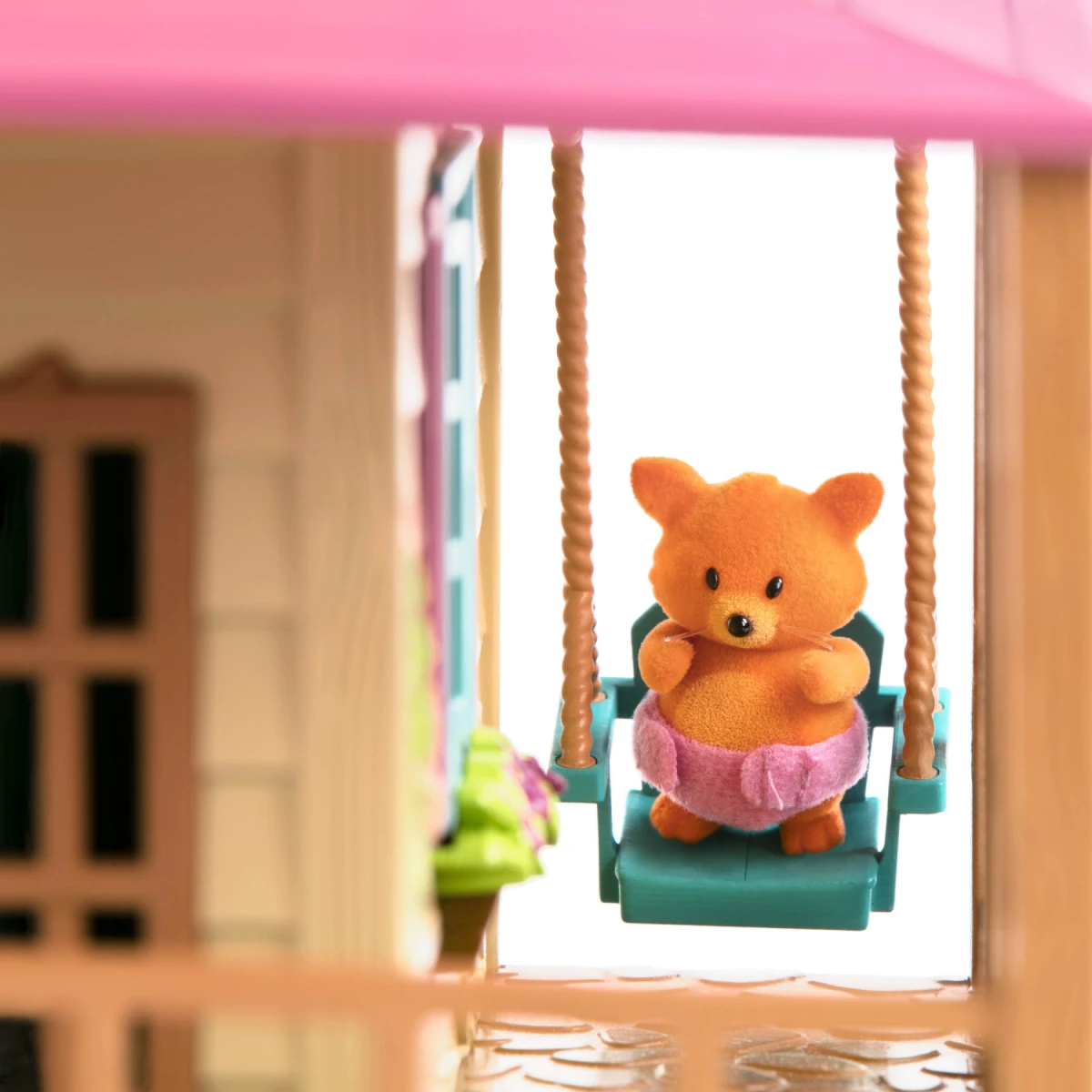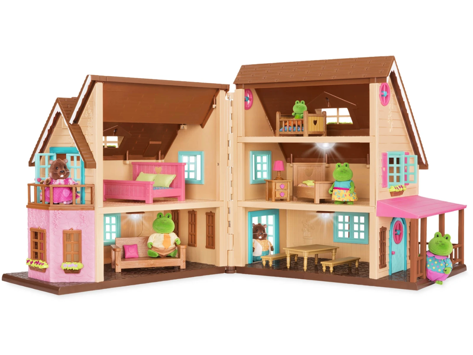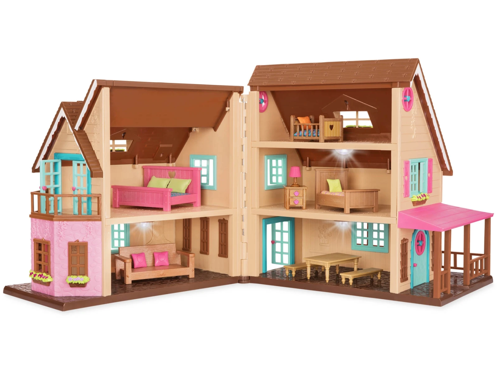 20-dílná sada obsahuje domeček s funkčními světly, pohovku, 2 polštáře, stůl a 2 lavice, postel s matrací a 2 polštáři, dětskou postýlku s matrací a polštářem, postýlku s matrací a polštářem, noční stolek, lampu a houpačku.