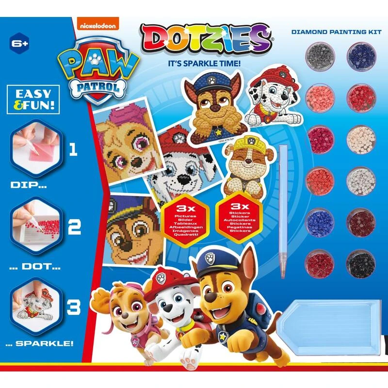 Diamantové malování 2v1 Tlapková patrola se sadou pro dva. Obsahuje 6 650 diamantů, 2× stylus, vosk, zásobník, obrázky a samolepky. Vhodné pro děti od 6 let