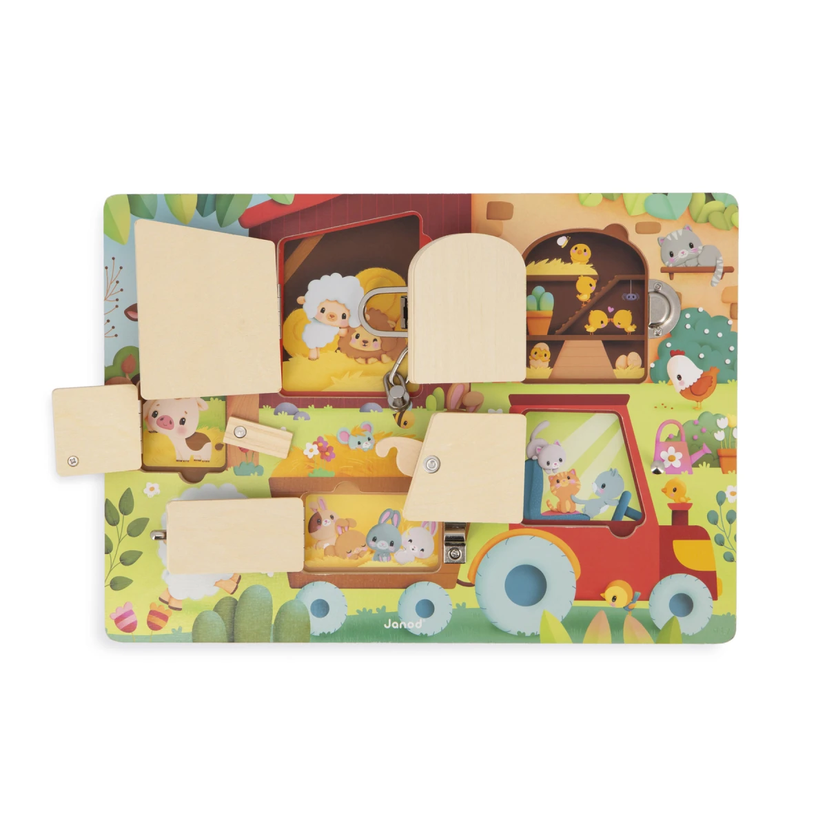 Má 5 dvířek s různými systémy otevírání: dřevěný hák, dřevěná západka, řetízkový zámek, přepínací západka a knoflíkový zámek. Každé dvířka mají jiné číslo a překvapení! Číslo se rovná počtu mláďat zvířat ukrytých za dvířky.