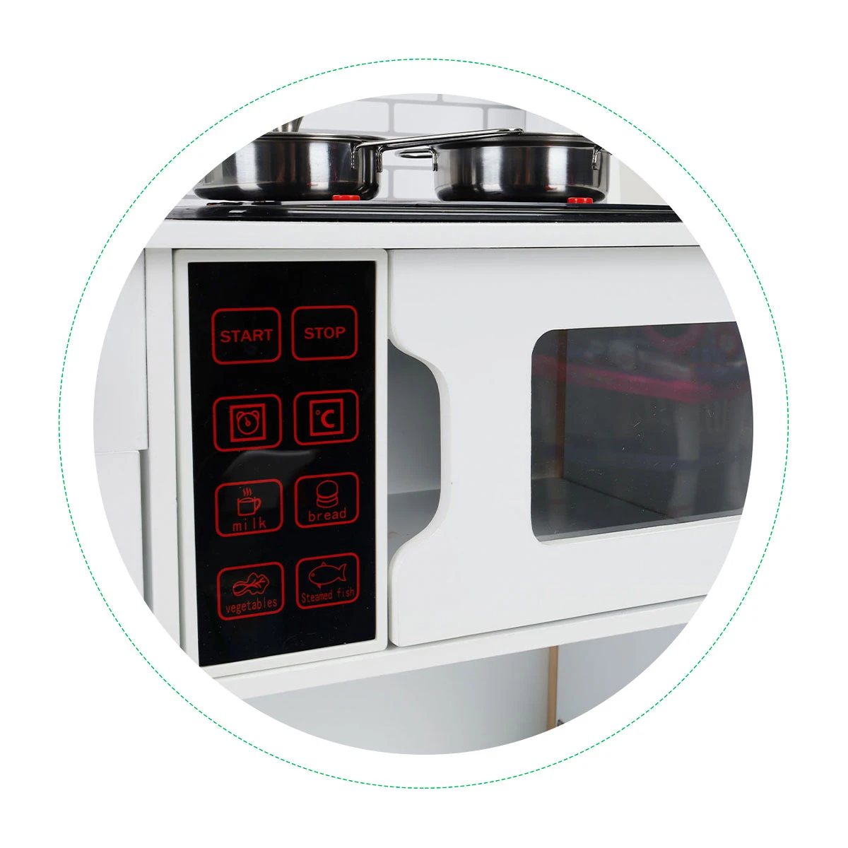 Malý šéfkuchař má k dispozici podsvícené hořáky, které navíc vydávají zvuk vařící vody. Pod pracovní deskou se nachází trouba, mikrovlnná trouba a velká skříňka na nádobí a potraviny. V horní části je umístěn ventilátor a praktické háčky na kuchyňské náčiní. Otevírací skříňky. Pořádek v kuchyni je základ a velké množství otevíracích skříněk s tím spolehlivě pomůže. Dostatek úložného prostoru potěší každého malého kuchaře i kuchařku a díky hře si dítě vytvoří návyk ukládat věci na své místo.