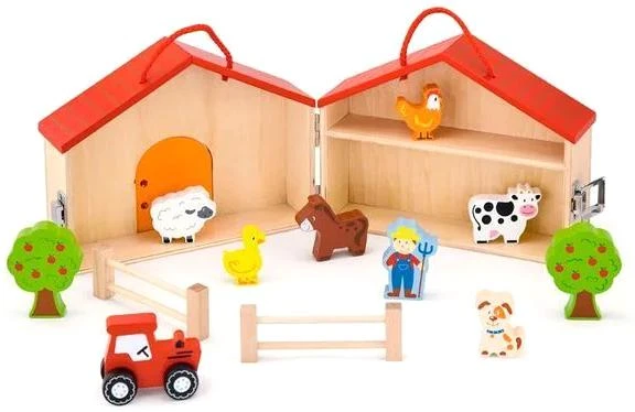 Balení obsahuje 6 dřevěných zvířátek, 2 stromy, traktor, farmáře a 2 ploty.