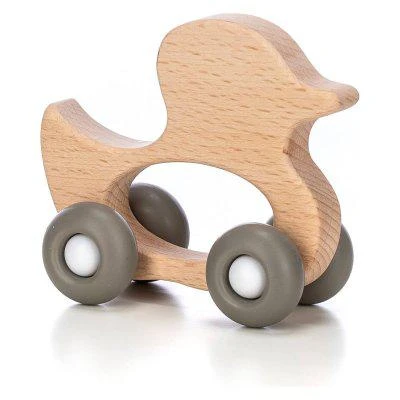 - dřevěné káčátko s kolečky ze silikonu lze tlačit a zároveň slouží i jako kousátko