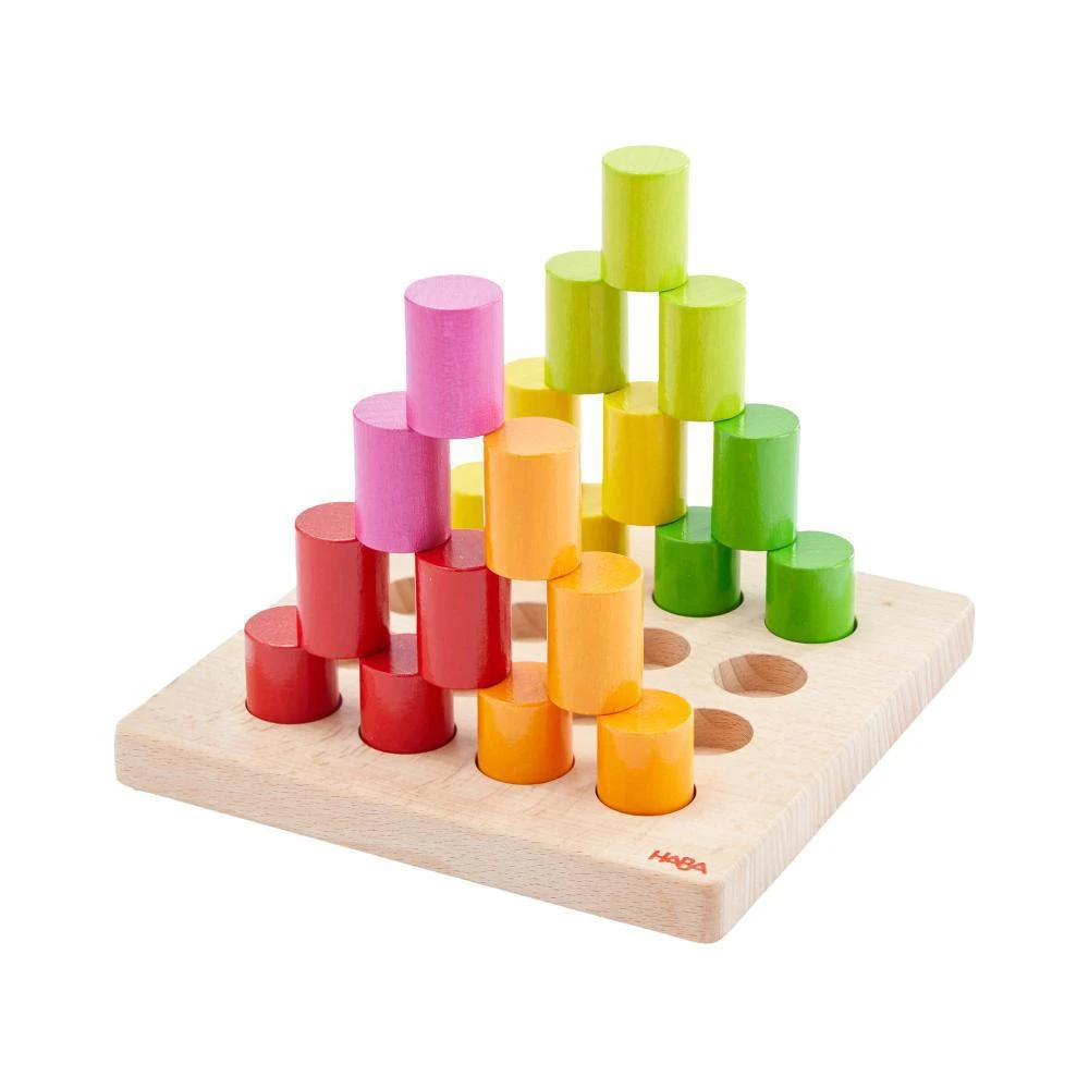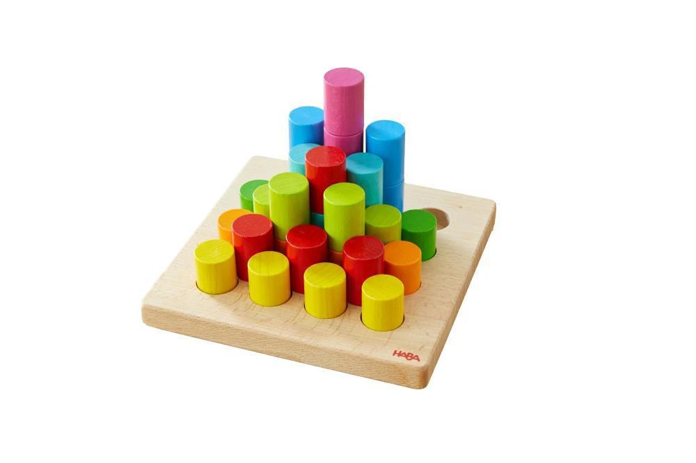 Na vrch desky můžete umístit válce– nebo s nimi stavět věže! 30 barevných válců je možné umístit do mřížky 4x4 podle přání do 16 předem vyražených otvorů na desce. Pokud jste trochu zkušenější, můžete vyzkoušet 10 oboustranných karet šablon ve 3 úrovních obtížnosti (v ceně). To znamená, že už nejsou jen umístěny vedle sebe, ale také naskládány na sebe – a na různých úrovních!