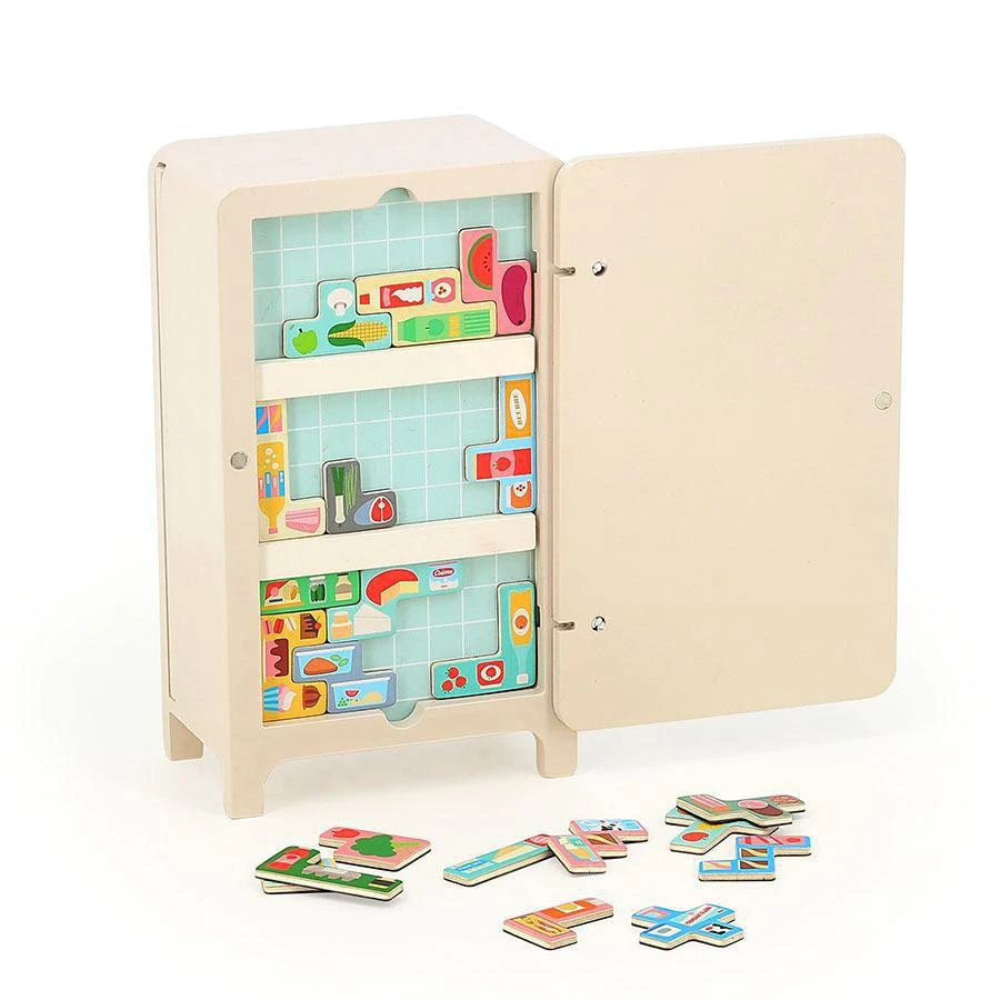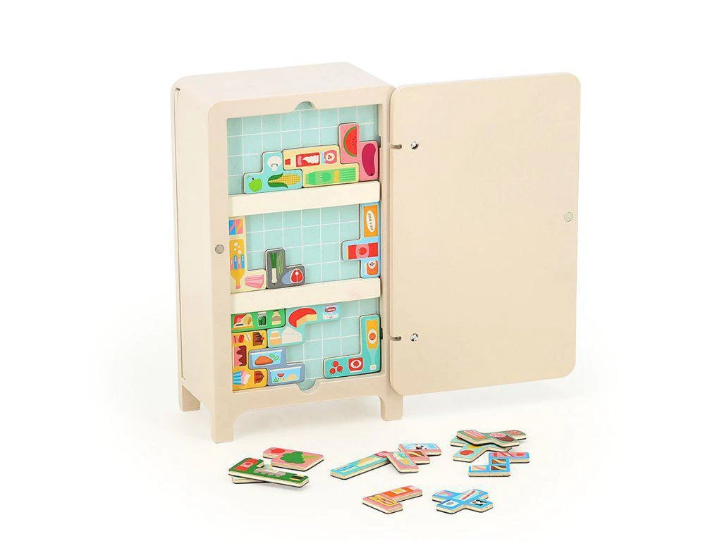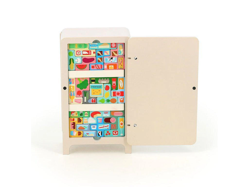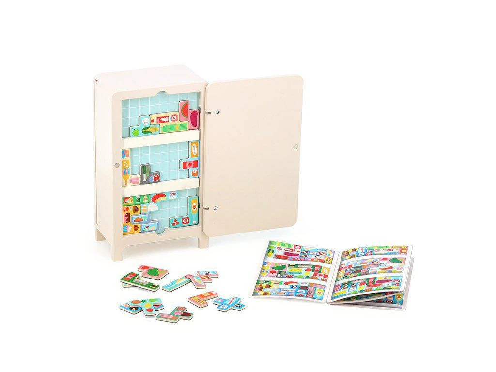 1 dřevěná lednice, 2 magnetické police, 21 magnetek potravin, brožura