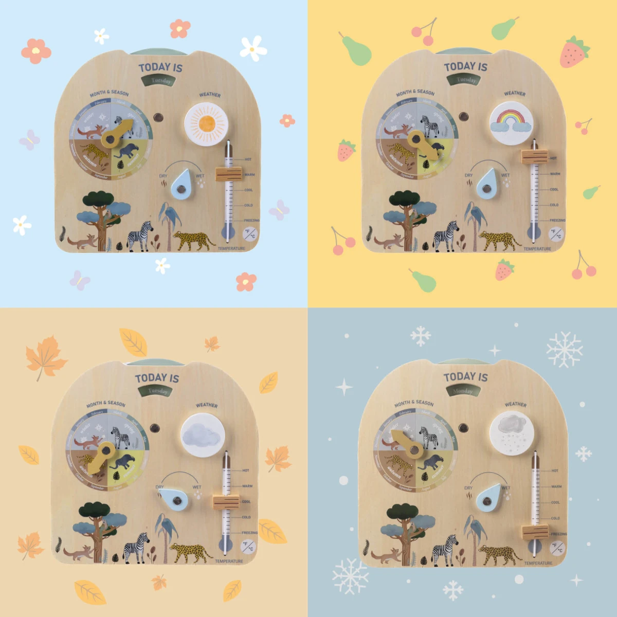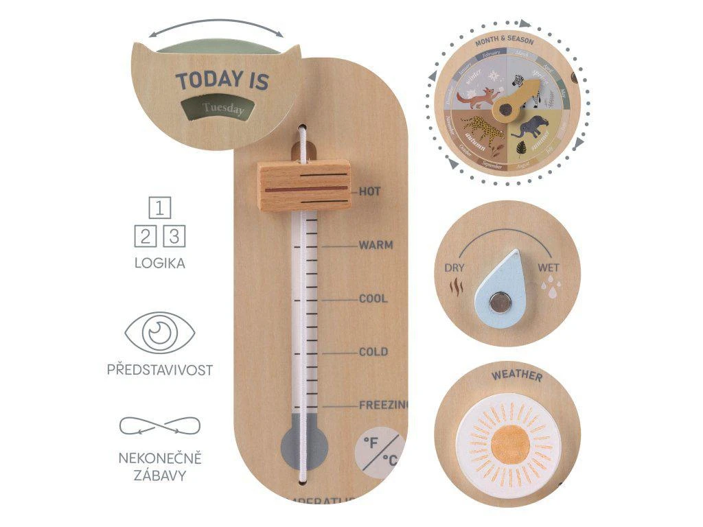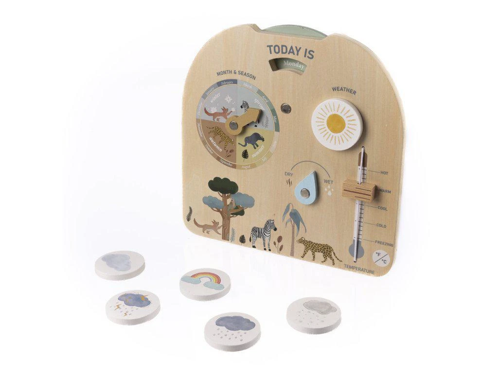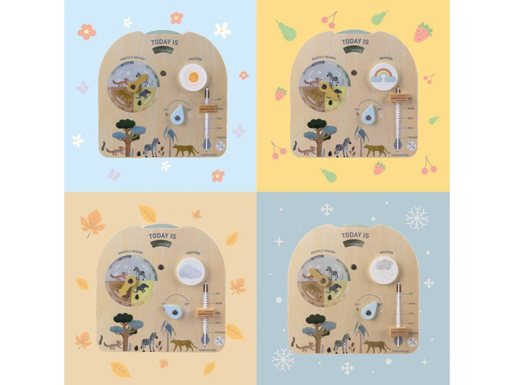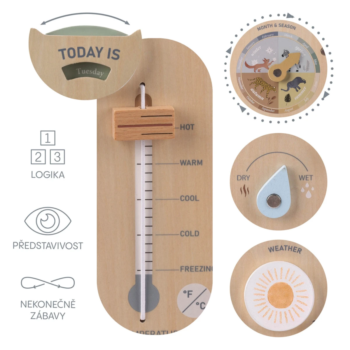 Tato deska je perfektní edukativní pomůcka do domácnosti i mateřské školy. Umožňuje dětem pochopit denní rytmus, proměnlivost počasí i základní přírodní jevy zábavnou a názornou formou. Interaktivní provedení povzbuzuje děti ke každodennímu používání – zvolit den, zhodnotit počasí za oknem, nastavit vlhkost i teplotu.