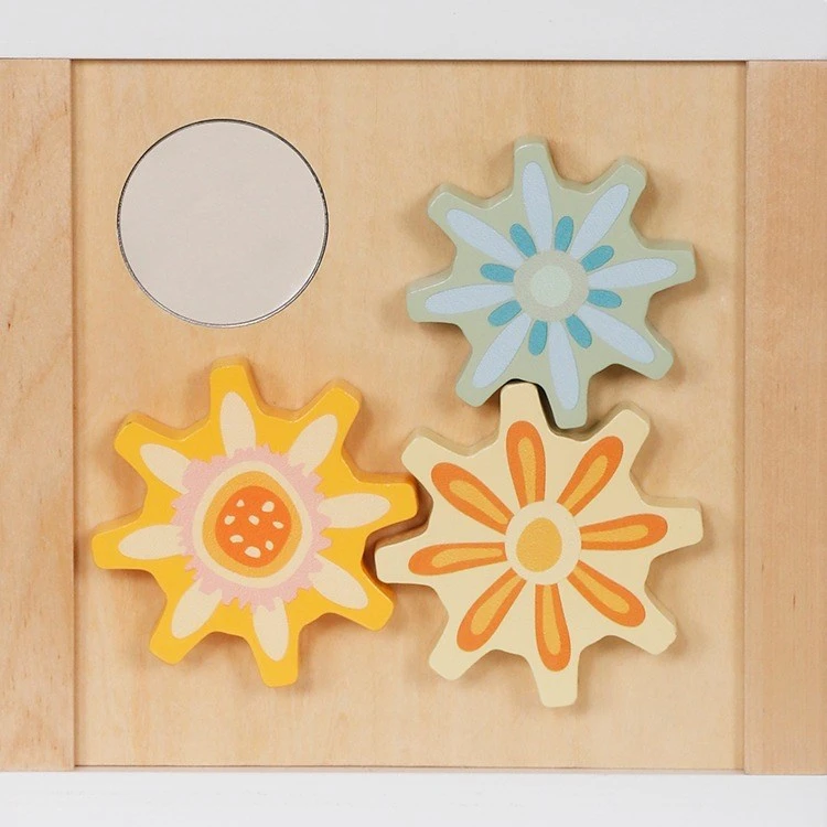 - 5 různých motorických aktivit v jedné hračce – labyrint s korálky, převlékací tvary, ozubená kolečka, zábavné kostky se zvířátky, zrcátko, posouvací prvky.